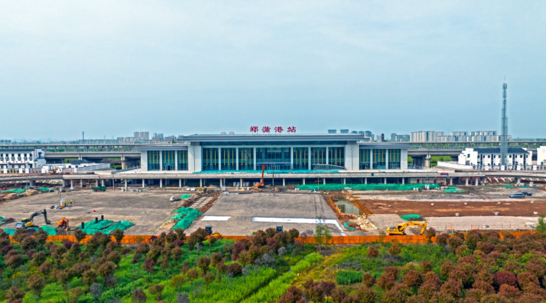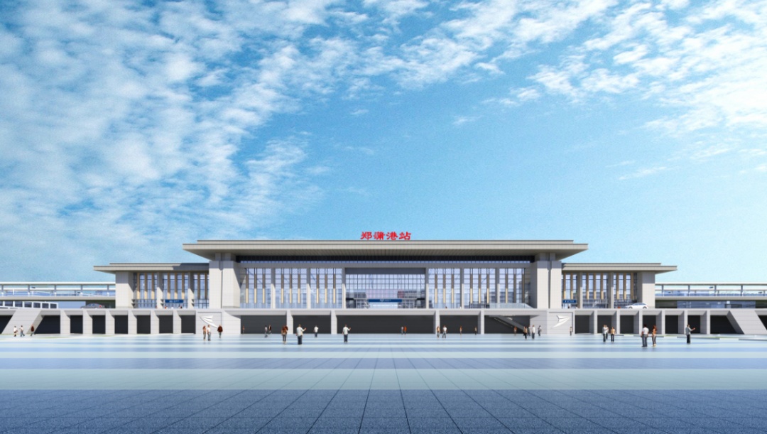 郑蒲港站位于马鞍山市郑蒲港新区境内,建筑面积9960.5平方米,建筑高度21.3米,为线侧下式站型,主体为钢筋混凝土框架结构,地下一层,地上一层,屋盖为空间钢网架结构。客流采用上进下出的流线形式,站场规模为2台4线。站房以“港城新区、城市门户、开放包容、再立华章”为设计理念,采用三段式建筑布局,突出中部主体,立面造型舒朗大气,建筑主体简洁稳重。室内空间丰富细腻,引入长江和港口文化元素,充分体现现代工业产业园开放包容的精神和城市门户的形象。