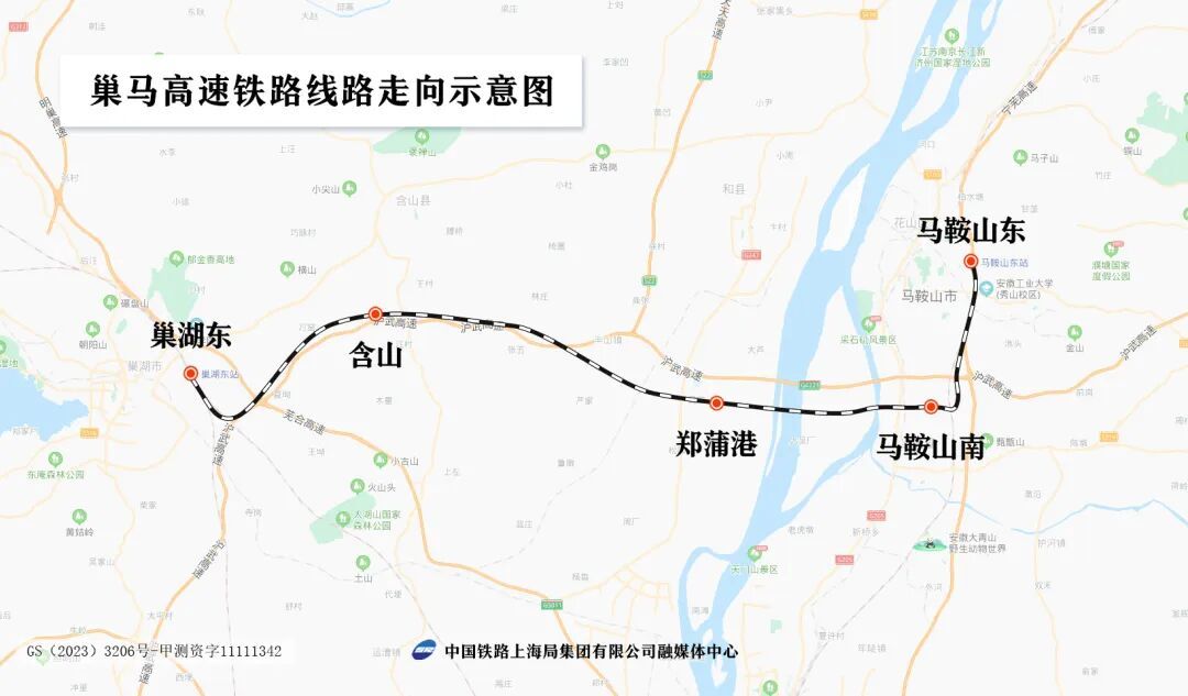 巢马高铁起于巢湖东站,向东经含山县、和县、郑蒲港新区、当涂县、经开区、雨山区、花山区后,引入马鞍山东站,正线全长61公里,设计时速350公里。沿线设巢湖东、含山、郑蒲港、马鞍山南、马鞍山东5座车站,其中巢湖东、马鞍山东为既有车站,其余为新建车站。