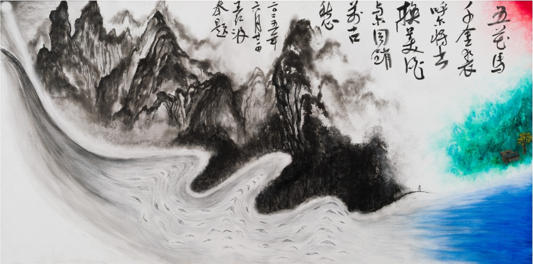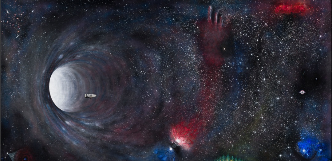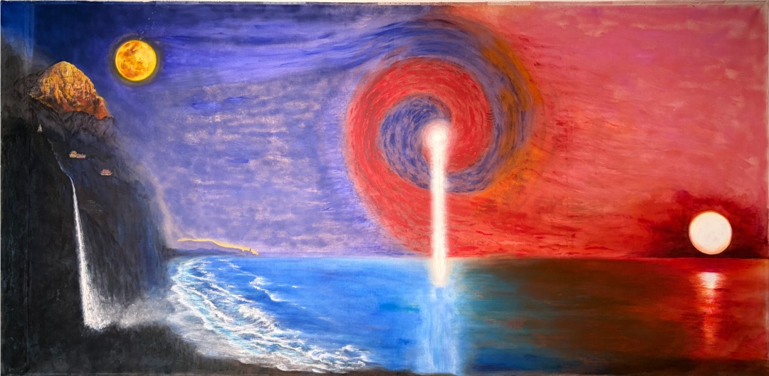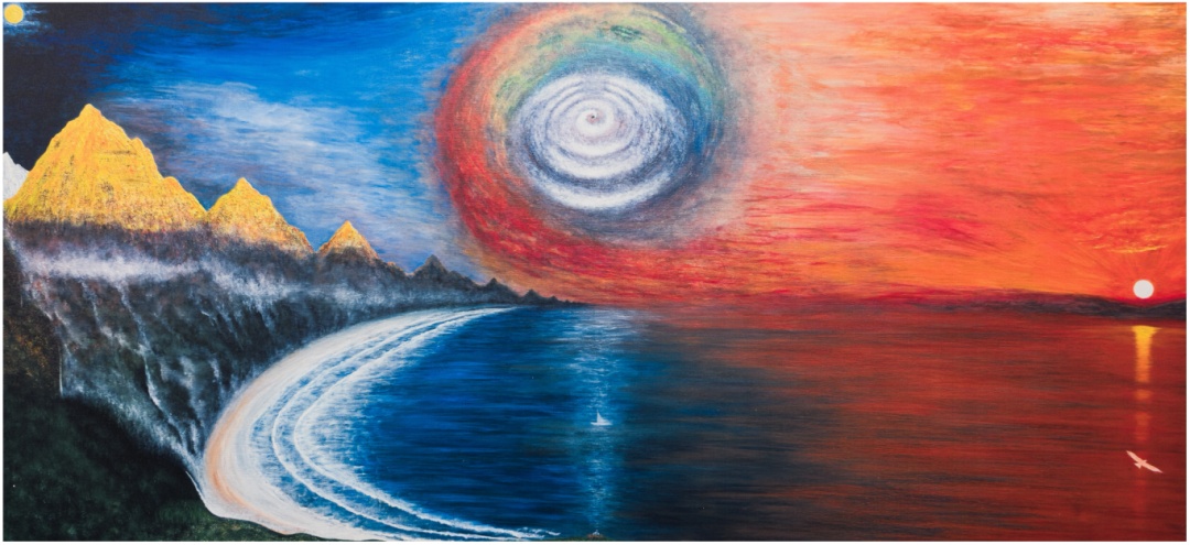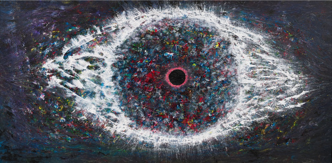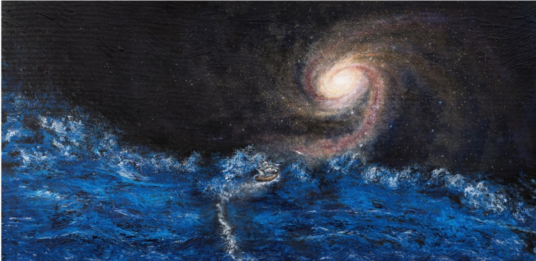 “一沙一世界,我知故我在”画展是艺术家山风水田的个人作品展,共展出作品近70幅,既有描绘地球自然与生命谱系的《春·金鳞》《夏·一花一世界》,也有探索宇宙科学叙事的《二向箔》《宇宙》。层层叠加的画面如同数据的迭代,大片流动的蓝仿佛能量场的铺陈,光、尘、雨、雪与地貌被反复擦拭、覆盖,再显影,形成了艺术家独树一帜的艺术语言。