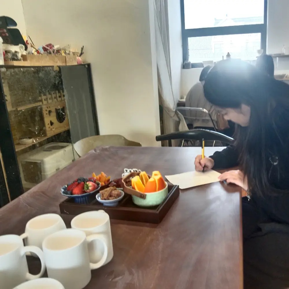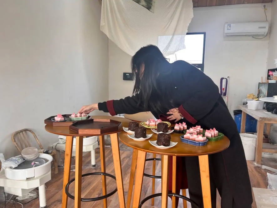 团建开始前一小时,我跟着店员们投入了前期筹备。一开始,我简单地将茶点随意组合摆放在桌上,没想到主理人笑着拍拍我的肩,教我做差异化搭配,保证每桌的甜品种类尽量多。我真切体会到,乡村小店的运营,从来都不是随性而为,藏在细节里的巧思,才最打动人心。摆好精致的茶点,我们又根据体验人数,精准分发陶艺制作的基础材料,确保每一位参与者都能有舒适的体验。