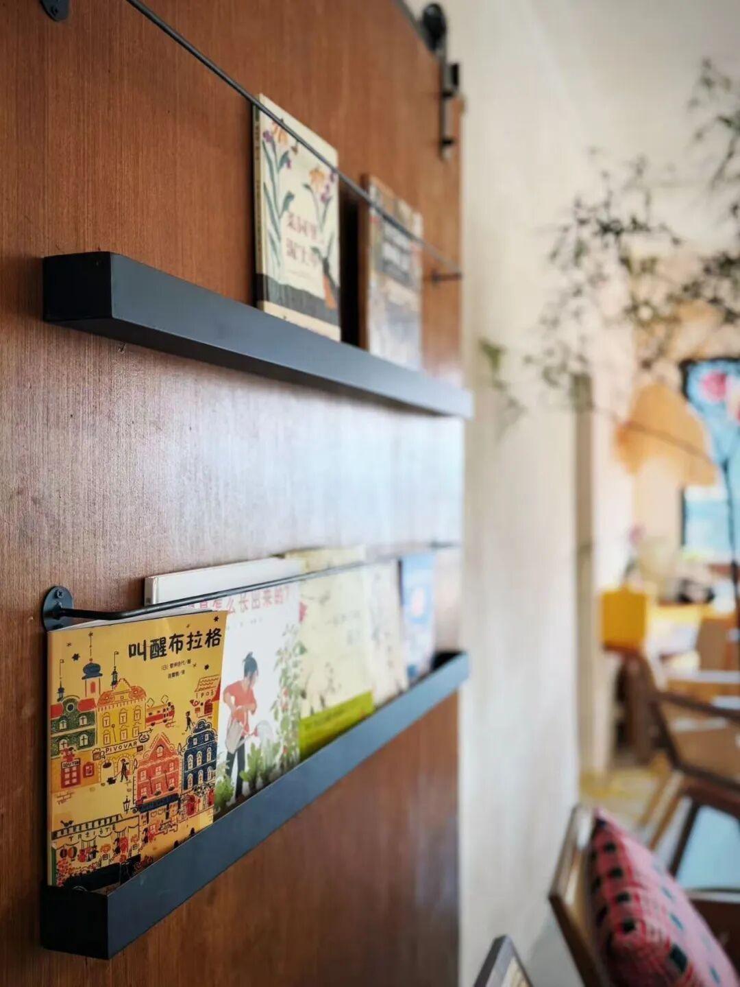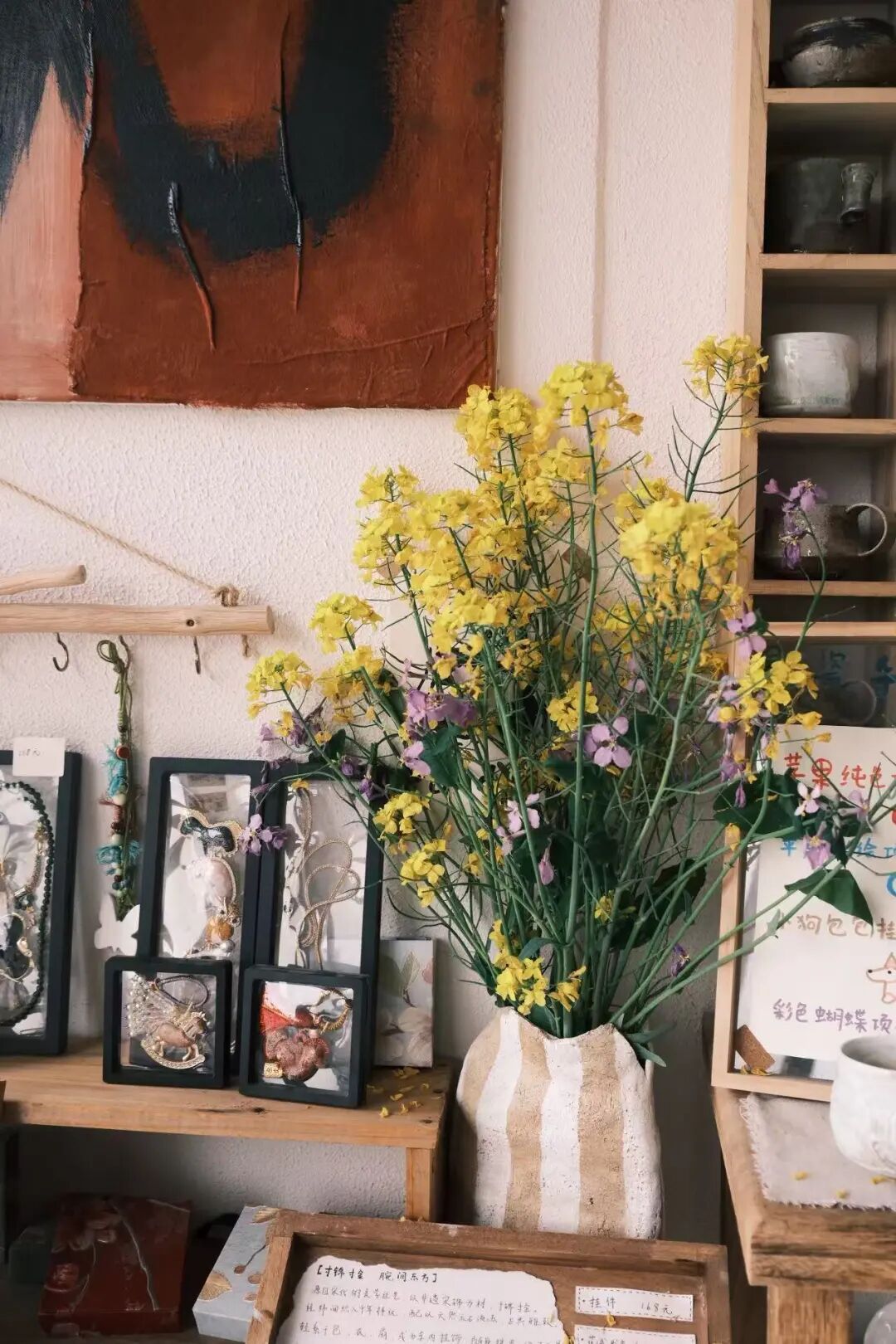 推门而入,屋内的布局中处处藏着主理人的巧思。整体空间设计上,一楼是咖啡饮品休闲区,咖啡的醇厚香气混着陶土独有的清润气息扑面而来,一侧的展架上错落摆着店员们手工制作的陶艺作品,这既是开放式的艺术品展示,也是可随心带走的文创好物。旁边的隔间专门用来存放待寄出的顾客成品,每一件都封存着独属于制作者的心意。而最让我挪不开眼的,是咖啡区旁那面嵌在墙里的书柜,柜里整整齐齐摆满了儿童绘本,从陶艺科普到自然美育,品类满满。