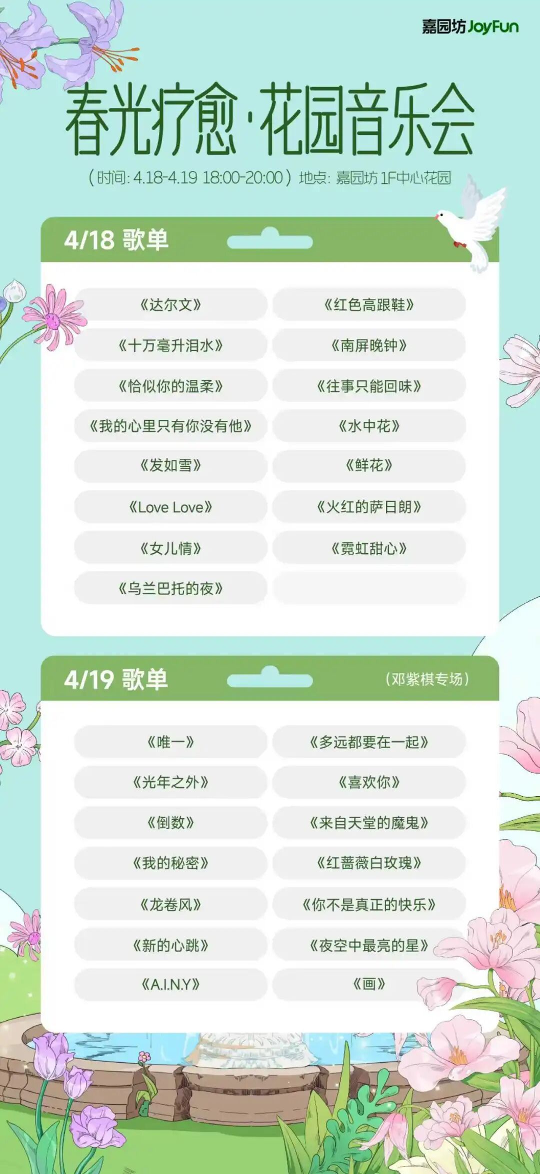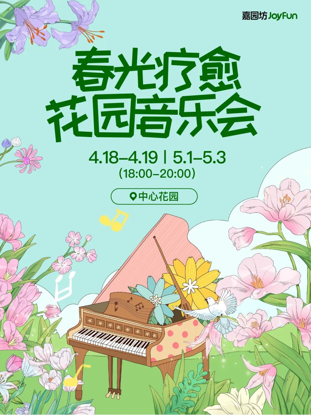 就在这周末! 嘉园坊 春光疗愈·花园音乐会即将开启! 旋律轻扬邂逅春日繁花 温柔音符治愈日常疲惫 快来一起聆听、沉浸、放松身心 在春光里邂逅美好与诗意吧! 此外,4月18日起 春日嘉园・花园秘境浪漫启动! 置身烂漫花丛之间 沉浸式邂逅限定美景 快来赴一场春日之约 美美打卡,定格美好瞬间吧! 不仅如此 还有超多店铺优惠 等你来发现! 嘉园坊拍照大赛即将启动 用镜头定格嘉园坊美好瞬间 参赛即有机会赢取 商户霸王餐 具体规则即将公布 敬请期待!