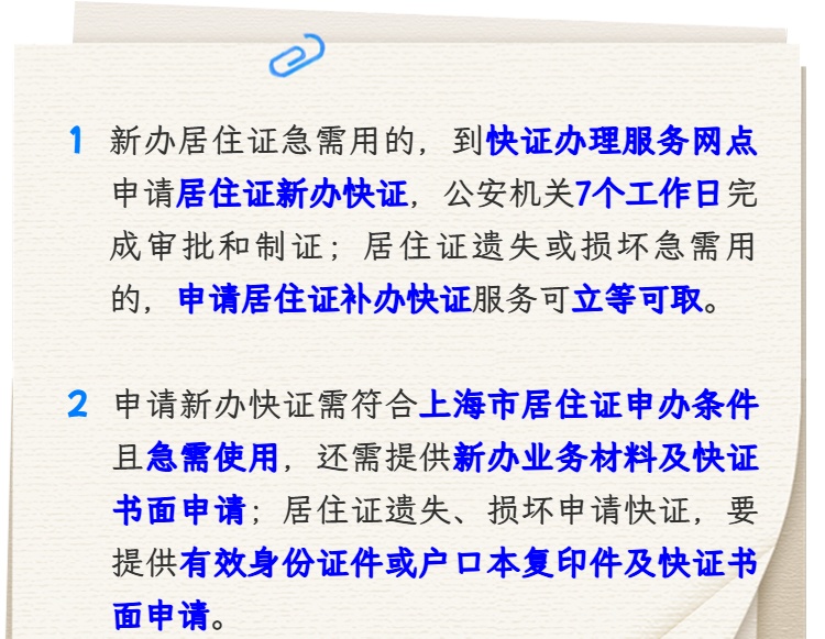 如您是新办上海市居住证,遇求学、考试、就医等情况急需使用居住证,可以到快证办理服务网点申请居住证新办快证服务,公安机关在7个工作日完成审批和制证;如您系居住证持证人,但居住证遗失或损坏,因求学、考试、就医等情况急需使用居住证的,可以到快证办理服务网点申请居住证补办快证服务,立等可取。