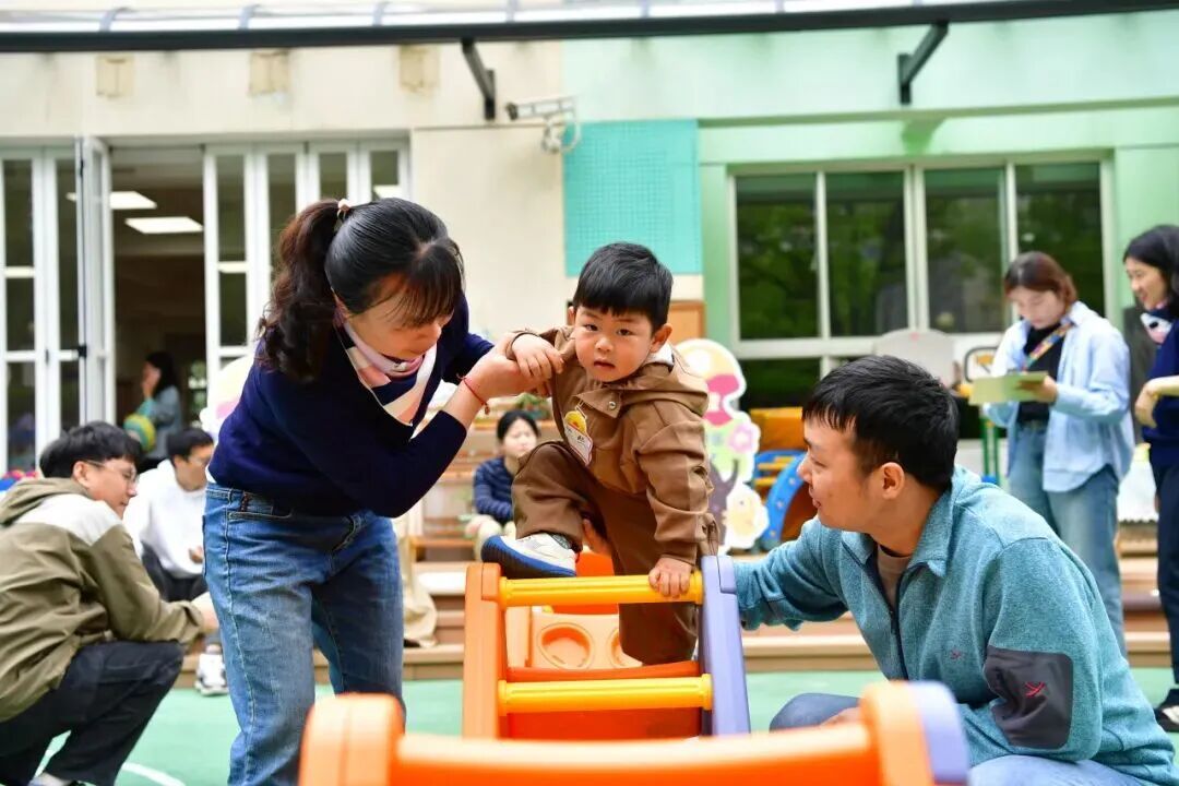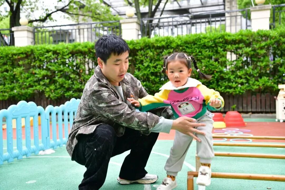 梅陇镇中心幼儿园中,“嘟嘟运球乐”“攀登绕绕乐”“跑酷跳跳乐”“圈圈隧道乐”“球球平衡乐”“转转投球乐”六大游戏分区层层递进,家长全程陪伴幼儿沉浸式参与,让孩子在玩乐中强健体魄、勇敢探索,亲子情感在协作与陪伴中升温。