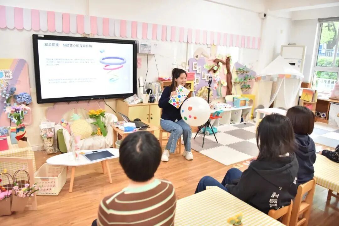 闵行区梅陇镇中心幼儿园托小班组教研组长孙艳开展波点气球创意美术工作坊,将精细动作与大肢体运动巧妙融合,在气球装饰、跑跳抛接、协作创作的趣味互动中,帮助家长掌握引导幼儿探索、创作的方法,为幼儿的运动能力、创造力及情感发展奠定坚实基础。