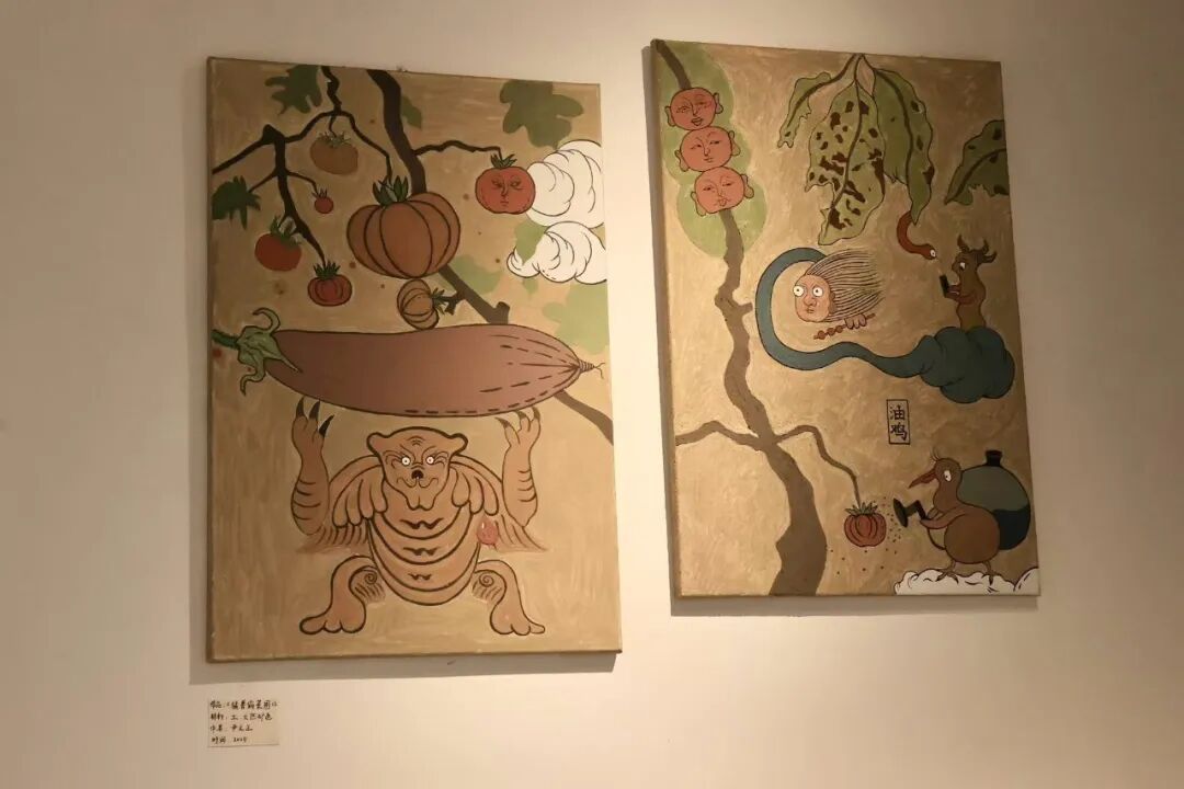“比如这组《猛禽偷菜图》的颜料就混入了马门村的泥土。”尹文正介绍说,该作品的灵感源于他在村中种菜的经历——不添加任何肥料,纯天然的种植方式,让他时常担心蔬菜会不会生虫,会不会被村里的鸡吃掉。于是,他从瓷片上找“角色”,最终转化为画布上生动的田园叙事。