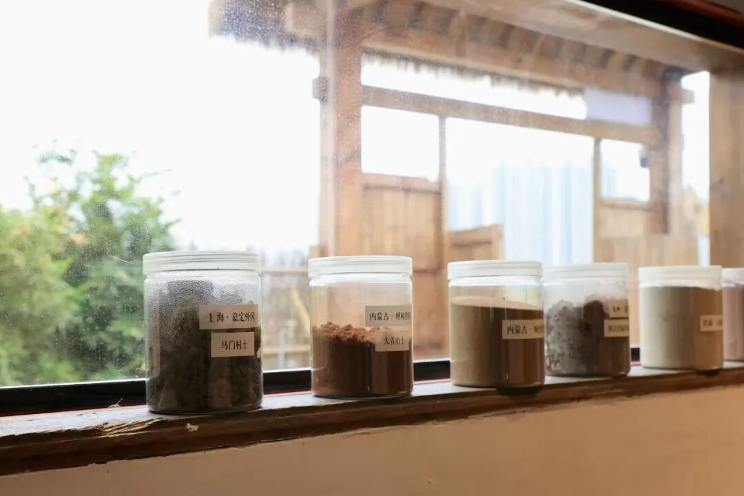 窗边几瓶装着泥土的透明罐子吸引了小嘉的注意,罐子上贴着具体地名,其中一瓶标有“上海·嘉定外冈”“马门村土”。据介绍,尹文正在绘画时,会将他收集的各地泥土与天然矿物颜料融合进行绘画。