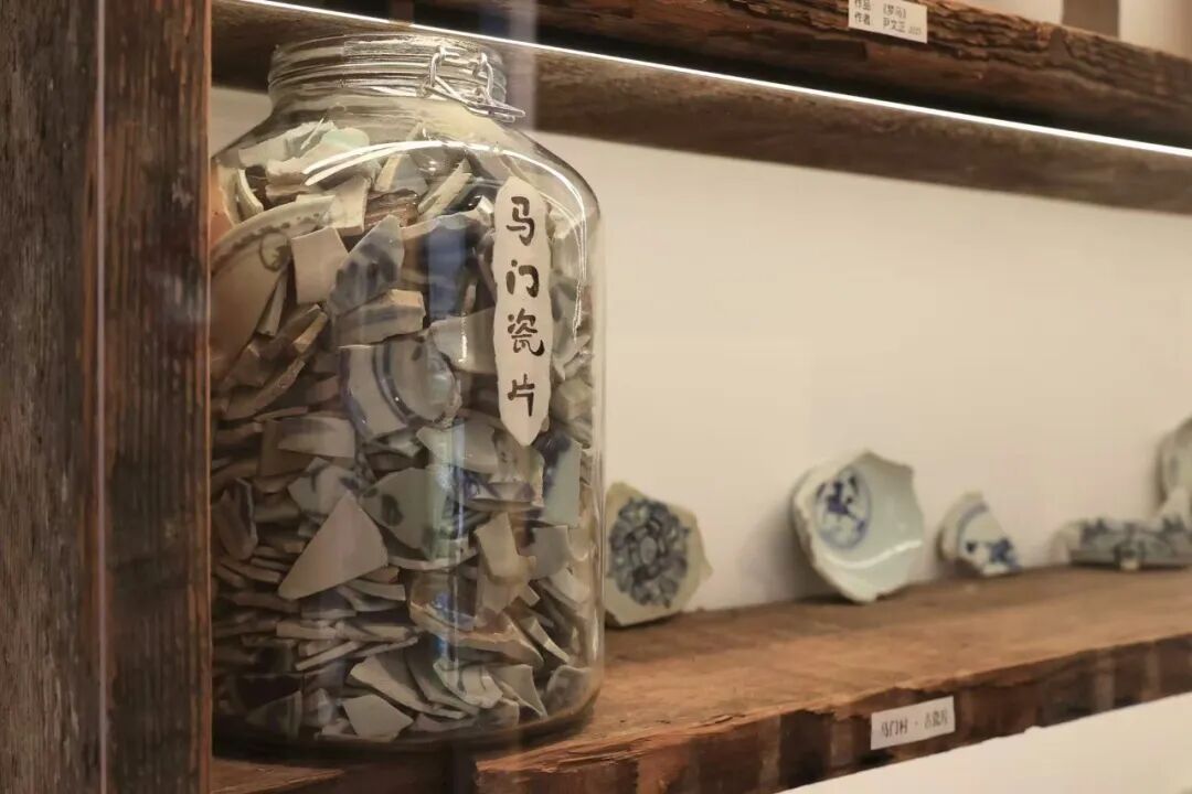 走进咖啡店,右侧展柜上,一罐标有“马门瓷片”的玻璃罐里装满了大小各异的残破瓷片,一旁还单独陈列着几片碎瓷,纹样虽不完整,但依稀可辨。