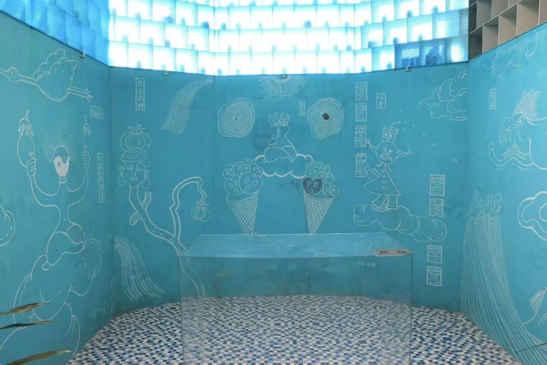 再往里走,蓝色墙面上布满了尹文正用白色粉笔现场绘制的各种不同风格和主题的“小神兽”。