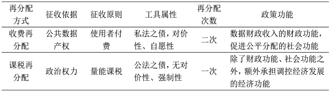 尽管收费与课税都是政府参与授权运营收益再分配的重要方式,但在具体的征收依据、征收原则、工具属性和政策功能上有所差异(见表1)。作为公共数据产权主体的政府通过授权方式,在一级市场进行公共数据的“半市场化”运营,由授权机构收取的运营服务费作为私法之债,具有对价性、自愿性,体现使用者付费原则。政府基于此获得数据财政收入后在内部进行的再分配,是对政府内部各数据提供部门公共数据“子产权”的实现。税收则是一种政府基于政治权力课征的无对价公法之债,具有无对价性、强制性特点,遵循量能课税原则。在这一原则之下,对公共数据课征税负并非依据纳税人使用了多少公共数据或从公共数据中获得了多少利益进行征收,而是根据其税收负担能力征收。公共数据授权运营的经济成果不应仅停留在政府财政之中,而是要重新反哺社会,用于促进数字经济与社会的共同发展。虽然两类再分配手段的最终目的都在于此,殊途同归,但二者所要解决的问题侧重、步骤、功能有所差异。课税再分配是一种仅有一个层级的再分配,所要解决的是公共数据授权运营所产生的收益在整个市场和社会中的再分配问题;收费再分配包括两个层级的再分配,首要解决的问题是在实现公共数据授权运营收益后不同产权主体之间的再分配问题,其后再以财政支出的形式解决其他再分配问题。此外,公共数据课税相比于运营服务费还多承载了一项重要功能,即除了承担筹措数据财政收入的财政功能、促进公平分配的社会功能,还要作为宏观调控工具发挥调控公共数据市场发展的经济功能。