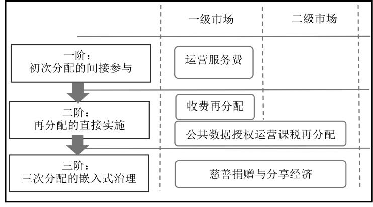 顾名思义,第三次分配在发生位序上处于初次分配、再分配(第二次分配)之后,是以社会意愿为分配尺度的“社会分配”,社会在分配之中处于核心位置。在公共数据收益中引入第三次分配是公共数据市场主体践行社会责任的规范化渠道,其以“科技向善”强化公共数据开发利用的公益性。由于公共数据授权运营的市场特色和产业特色,政府在初次分配和再分配之中皆是作为外在于社会的主导者、管理者,但在第三次分配中,社会居于核心位置,政府既不能作为不相关的第三人置身事外,也不能采用单向度、传统的管理举措来径直命令、规制慈善捐赠。在这种“管”与“放”的纠结与徘徊中,政府需要嵌入社会之中,加强与社会的良性沟通,以共同治理者姿态参与第三次分配。此即,政府不是外在于社会且单向度直接作用于社会,而是内嵌于社会之中,通过对社会的充分赋权以实现对收益第三次分配的相关社会行为及相应产业的引导。这种嵌入式治理也是完善政府数据治理、提升现代政府治理能力的重要路径。党的十九届四中全会提出“重视发挥第三次分配作用,发展慈善等社会公益事业”,正式明确慈善捐赠成为第三次分配的重要手段。公共数据授权运营收益的第三次分配既与其他生产要素共享慈善捐赠路径,又衍生出分享经济等数据要素特殊的第三次分配方式。慈善捐赠主要通过慈善组织或平台,进行公共数据授权运营所产生收益的直接募集、捐赠。公共数据市场中,公共数据产品除了能带来直接收益外,其产品本身往往被视为潜在收益能力的直接表征。由于公共数据产品的分享不具有独占性和排他性,市场企业可以不通过直接的收益捐赠,而通过公共数据产品共享的方式,免费向他人提供这种间接的收益能力。此即数据要素市场特有的“数据慈善捐赠”。例如DeepSeek开源大模型就是分享经济的典型,其将部分项目的源代码、模型权重及相关技术资源公开,允许他人免费查看、使用、修改和分发。总而言之,在公共数据授权运营收益的第三次分配中,政府作为内嵌于社会的共同治理者角色,将以合作者和助推者身份参与慈善捐赠和分享经济。作为合作者,政府既要对社会放权,又要对慈善乱象予以治理,通过与慈善组织、数据平台开展密切合作方式,合作监管收益的直接捐赠和公共数据产品共享。作为助推者,政府需要以税收优惠、金融帮扶等温和的经济政策而非僵硬的行政管制工具,潜移默化地引导和激励社会主体积极参与到第三次分配中。分配制度作为市场的基础性制度,无论是一级市场还是二级市场都会各自形成三层分配结构。理论上若以市场层级为横坐标、分配层级为纵坐标,公共数据授权运营遵循“2(市场两层级)×3(分配三层级)=6(收益分配区域)”的坐标系逻辑,形成收益分配的“六宫格”格局(见图1)。基于实践需求和主体限定对“六宫格”进行结构性拆分、合并和调整,加之政府作为塑造授权运营收益分配新规则的主导者积极发挥经济管理职能,其参与收益分配的三阶构造方案得以搭建成型(见图2),并通过公共数据运营服务费、公共数据授权运营课税、慈善捐赠与分享经济等具体法律制度实现方案的落地。前述诸多制度属于新兴事物,其科学构建既要综合理论拓展与实践经验各自推进,又要具有系统思维,重视不同制度间的协同配合,使得各个制度之间相互协同、功能耦合进而产生“整体大于其部分之和”的法治功效。进言之,公共数据运营服务费制度覆盖一级市场公共数据收益的初次分配和再分配,公共数据授权运营课税制度同时覆盖一级和二级市场的再分配,慈善捐赠与分享经济制度同时覆盖一级和二级市场的第三次分配。图2 政府参与公共数据授权运营收益分配的三阶构造方策