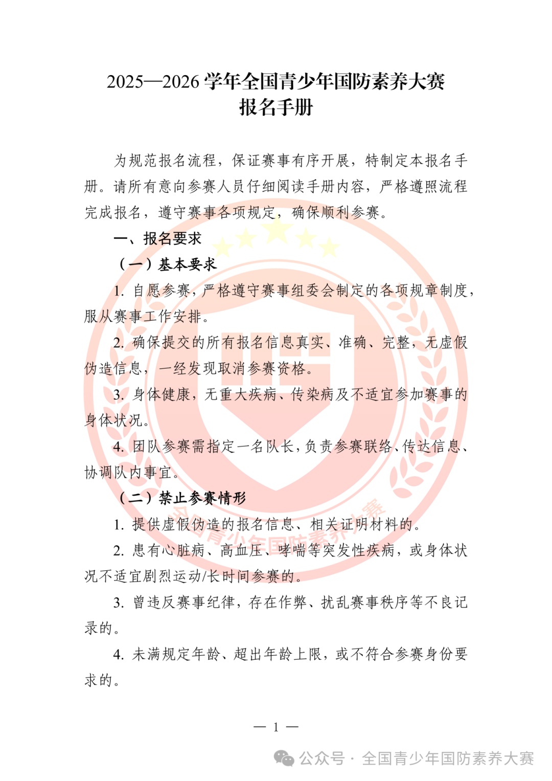 2025—2026学年全国青少年国防素养大赛报名系统已正式上线,即日起开放,热烈欢迎广大青少年朋友报名参与,具体操作流程详见报名手册。相关事项说明如下: