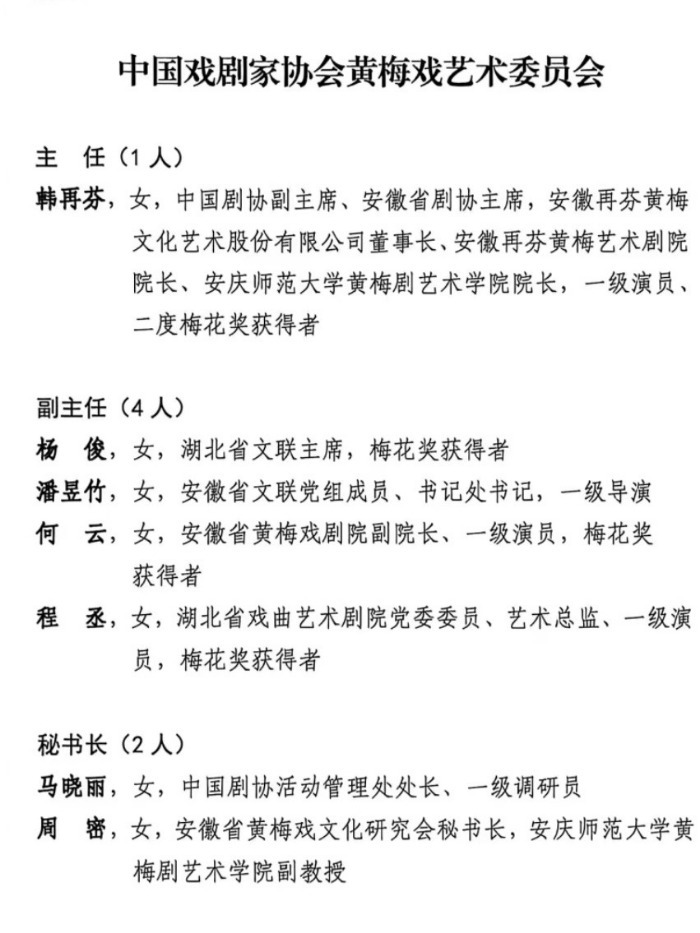 中国剧协分党组书记、驻会副主席陈涌泉主持大会。中国文联党组成员、书记处书记李昕出席大会。成立大会上,陈涌泉宣读了《中国戏剧家协会关于成立黄梅戏艺术委员会及艺委会成员聘任的决定》。中国戏剧家协会黄梅戏艺术委员会成员32人,顾问13人。其中,中国剧协副主席、安徽省剧协主席韩再芬被聘任为主任,湖北省文联主席杨俊,安徽省文联党组成员、书记处书记潘昱竹,安徽省黄梅戏剧院副院长何云,湖北省戏曲艺术剧院党委委员、艺术总监程丞被聘为副主任。