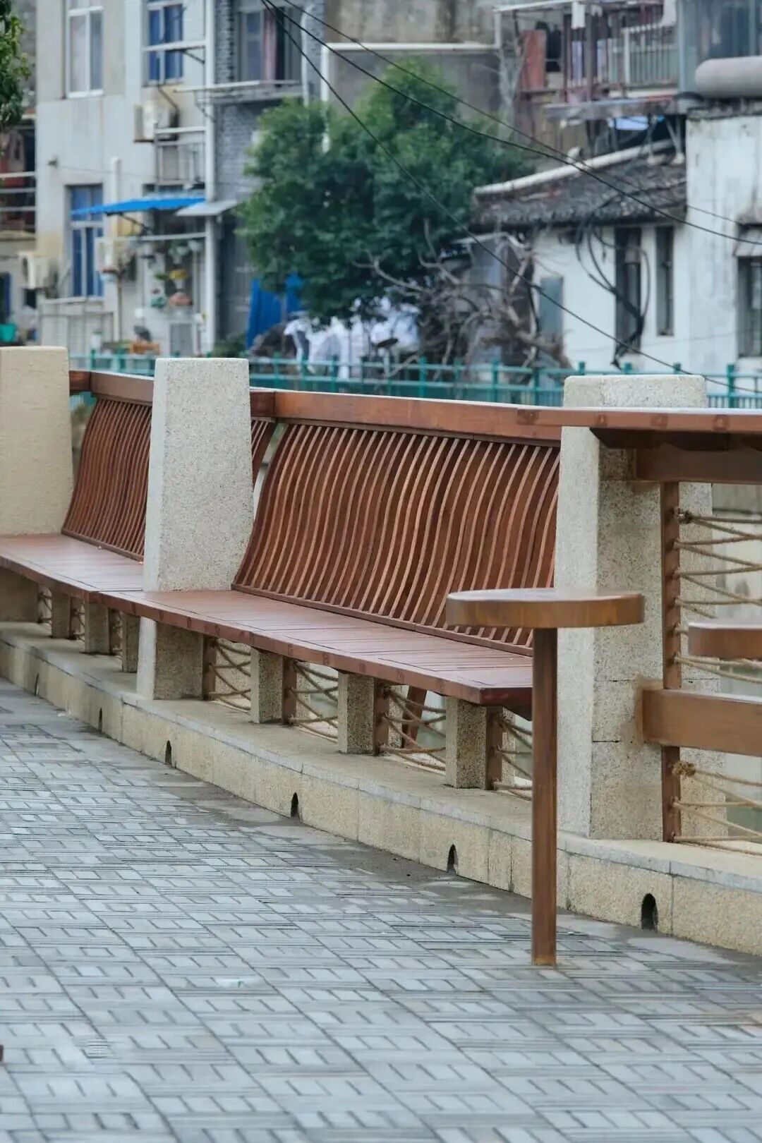 花舟古渡重塑滨水闲居图景,整合健身、充电、休憩等多元便民功能,栏杆与座椅巧妙融入龙舟造型,暗合罗店龙船习俗的非遗底蕴,让这片滨水空间既有亲水的惬意,又有文脉的厚重,成为居民茶余饭后亲水休闲、闲话家常的活力聚集地。