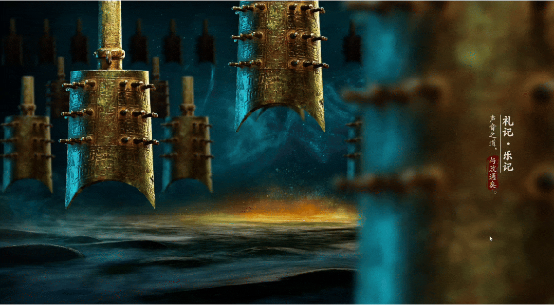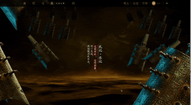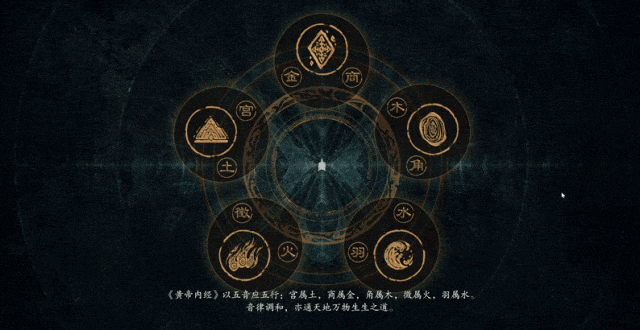 「乐」篇章以“礼乐之邦”为主题,依据《礼记·乐记》与《黄帝内经》的记载,将治世之理与中国传统的五音(宫、商、角、徵、羽)、五行(金、木、水、火、土)相融合。