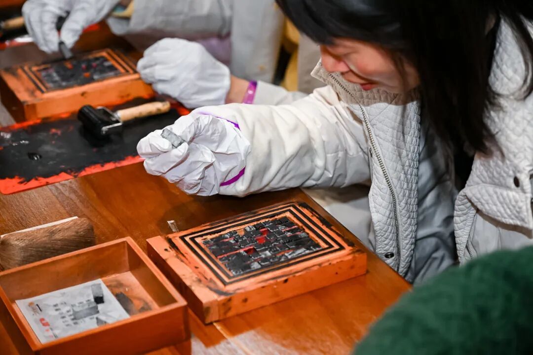 7楼“物以载文 文以载道”主题展区由上海印刷博物馆策展,现场陈列字模、石印机、铜模箱等珍贵历史实物,串联起雕版、活字、数字等三大印刷技术革命。展区内还设有雕版印刷、木版套印、汉字印刷字体书写、石版印刷、铅活字拓版印刷等非遗项目,体验感十足。