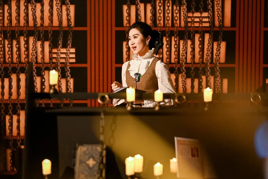 中世纪铁链图书馆场景中,“侧耳”主播王吟吟诵《玫瑰的名字》与《缮写士科伦基尔》选段。