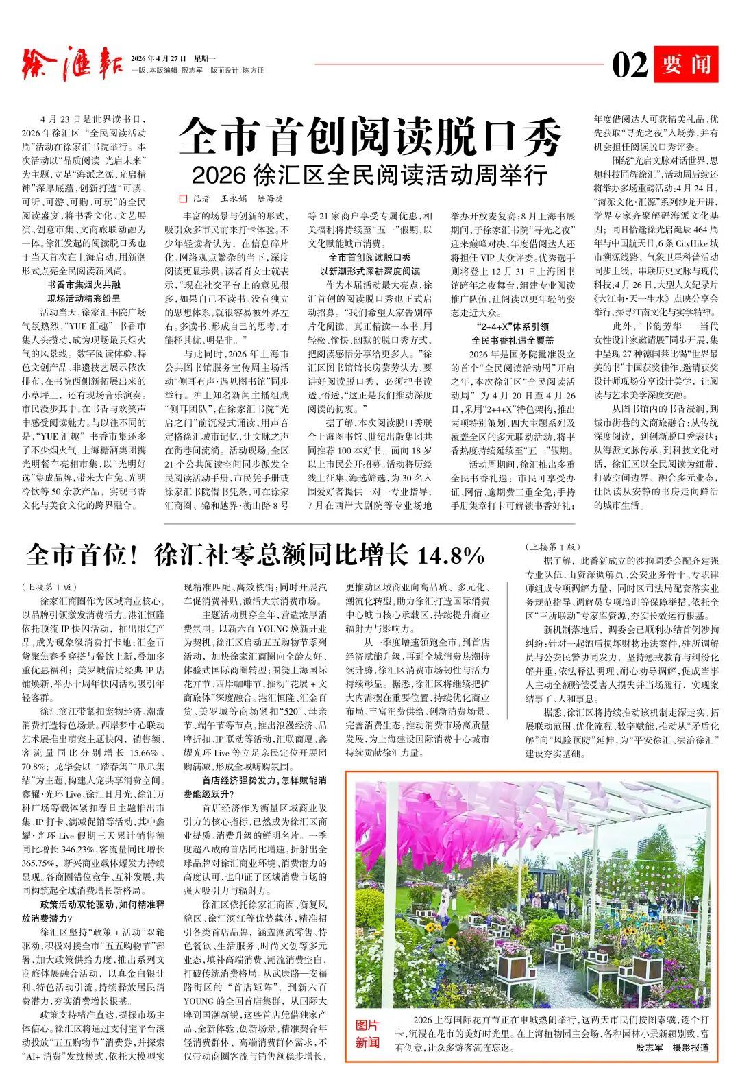 4月23日是世界读书日,2026年徐汇区“全民阅读活动周”在徐家汇书院温暖启幕,主题是“品质阅读 光启未来”。其中,由徐汇首创的阅读脱口秀,也在全市首次启动。用新潮幽默深耕深度阅读,成为最大亮点。书香市集烟火共融,笑声朗朗徜徉街巷,让阅读可游可玩可品。徐汇以全民阅读为纽带,打破空间边界、融合多元业态,让书香从书房走向城市生活,在欢笑中点亮幸福未来。