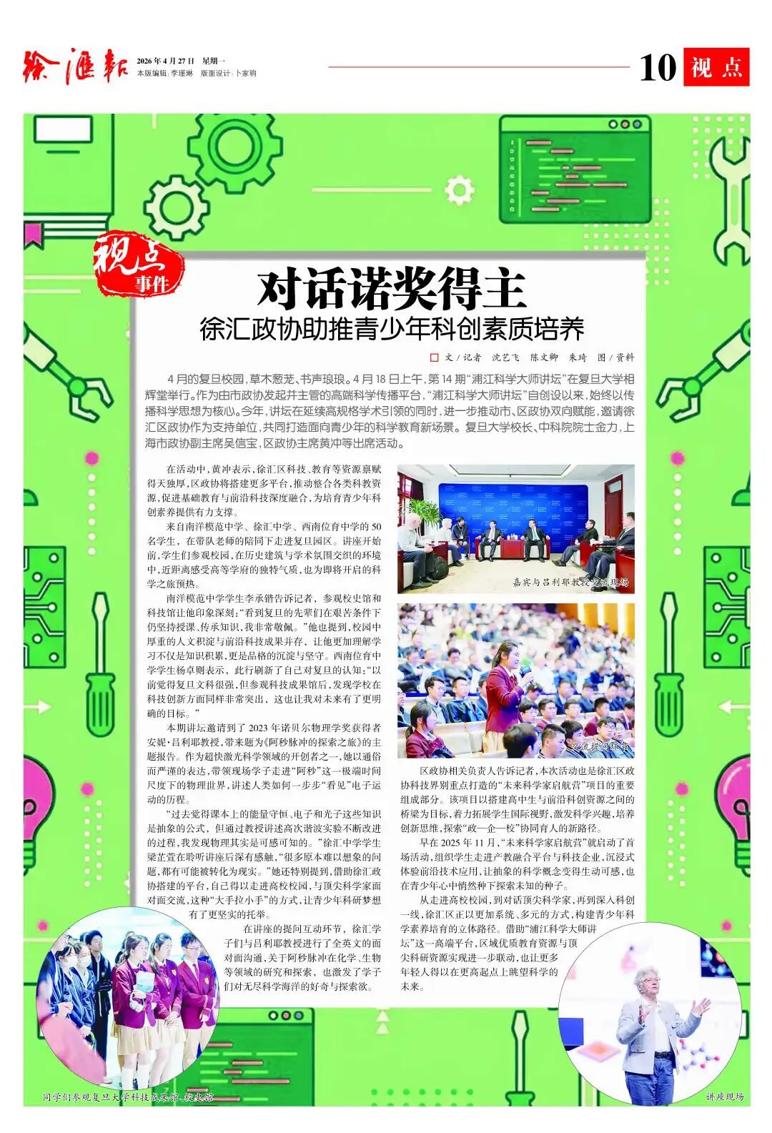 第14期“浦江科学大师讲坛”在复旦相辉堂温柔启幕,诺奖得主安妮·吕利耶教授带孩子们走进“阿秒”的奇妙世界。课本里抽象的公式,在她娓娓道来中变得鲜活可感——孩子们用全英文与科学家对话,眼里闪着光。徐汇借此把优质教育与顶尖科研资源轻轻牵在一起,让“大手拉小手”成为现实。愿每一个年轻人,在更高起点上仰望科学的星辰大海,心怀好奇,笑着奔向属于自己的广阔未来!