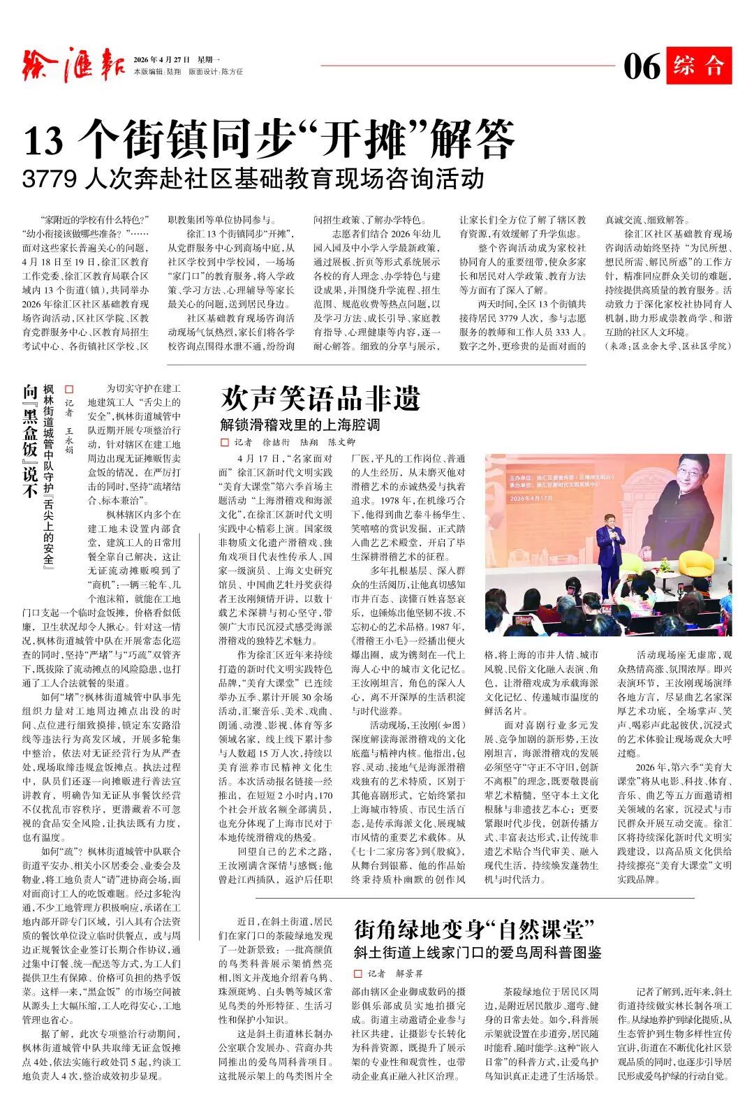 徐汇“美育大课堂”第六季首场近日开讲,滑稽戏名家王汝刚带大家细品“上海滑稽戏和海派文化”,报名秒光。他说,滑稽戏要“守正不守旧,创新不离根”——包容、灵动、接地气,让上海腔调有温度。新一季“美育大课堂”还将请来电影、科技、音乐、曲艺等名家,沉浸式互动把艺术送到市民身边。徐汇将持续擦亮品牌,用高品质文化供给,让非遗在笑声中活起来、传下去。