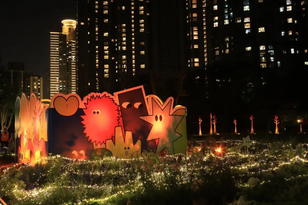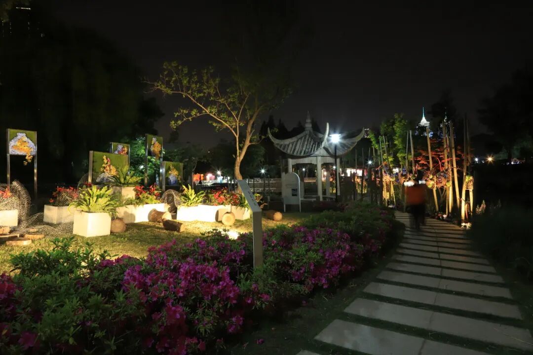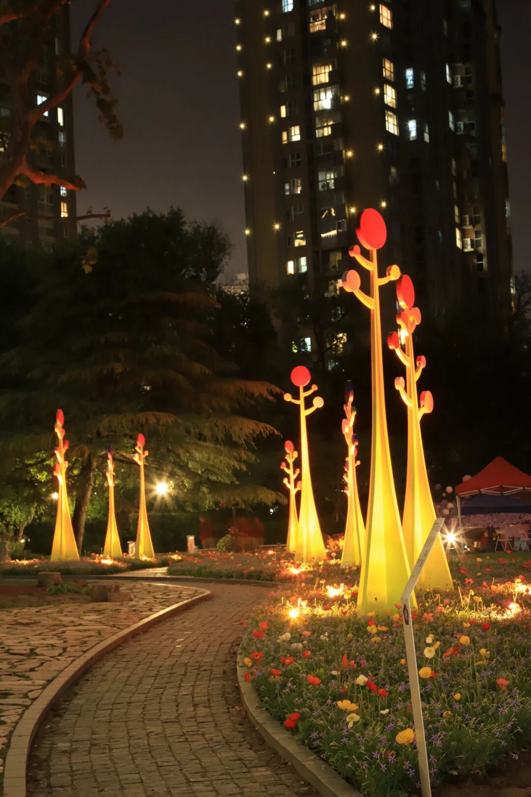 公园门口的“花囡囡”亮起了灯,以诚挚的笑脸欢迎大家夜游花卉节。“Momo精灵部落”的几个打卡点位没有了白天的喧闹,市民可以尽情观赏。