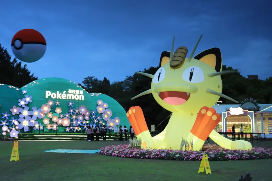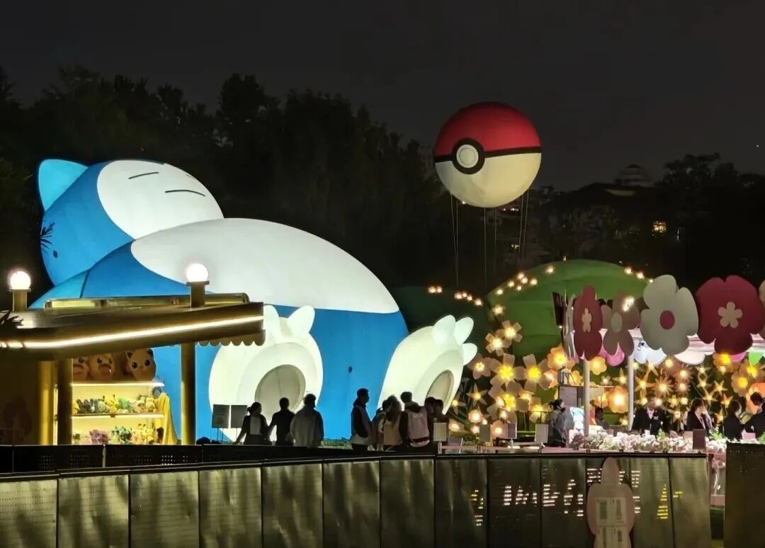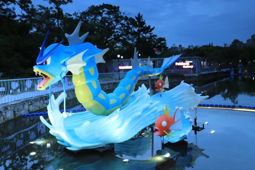 白天憨态可掬的卡比兽气模,在夜色中化身草坪上的巨型“发光梦境”,吸引不少市民驻足合影。陈家池水面上,等身大的暴鲤龙与鲤鱼王玻璃钢雕塑配合水下灯光,跃然出水、气势十足,成为夜游最吸睛的打卡点之一。