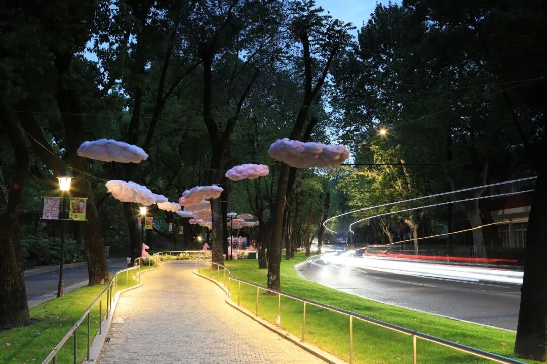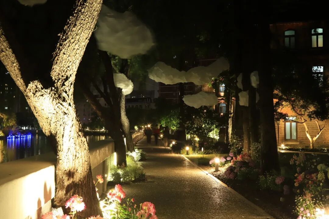 “Old Money浪漫部落”入夜后更显复古浪漫。万航渡路沿线的“林中奇骥”在灯光勾勒下呈现童话般的剪影效果。