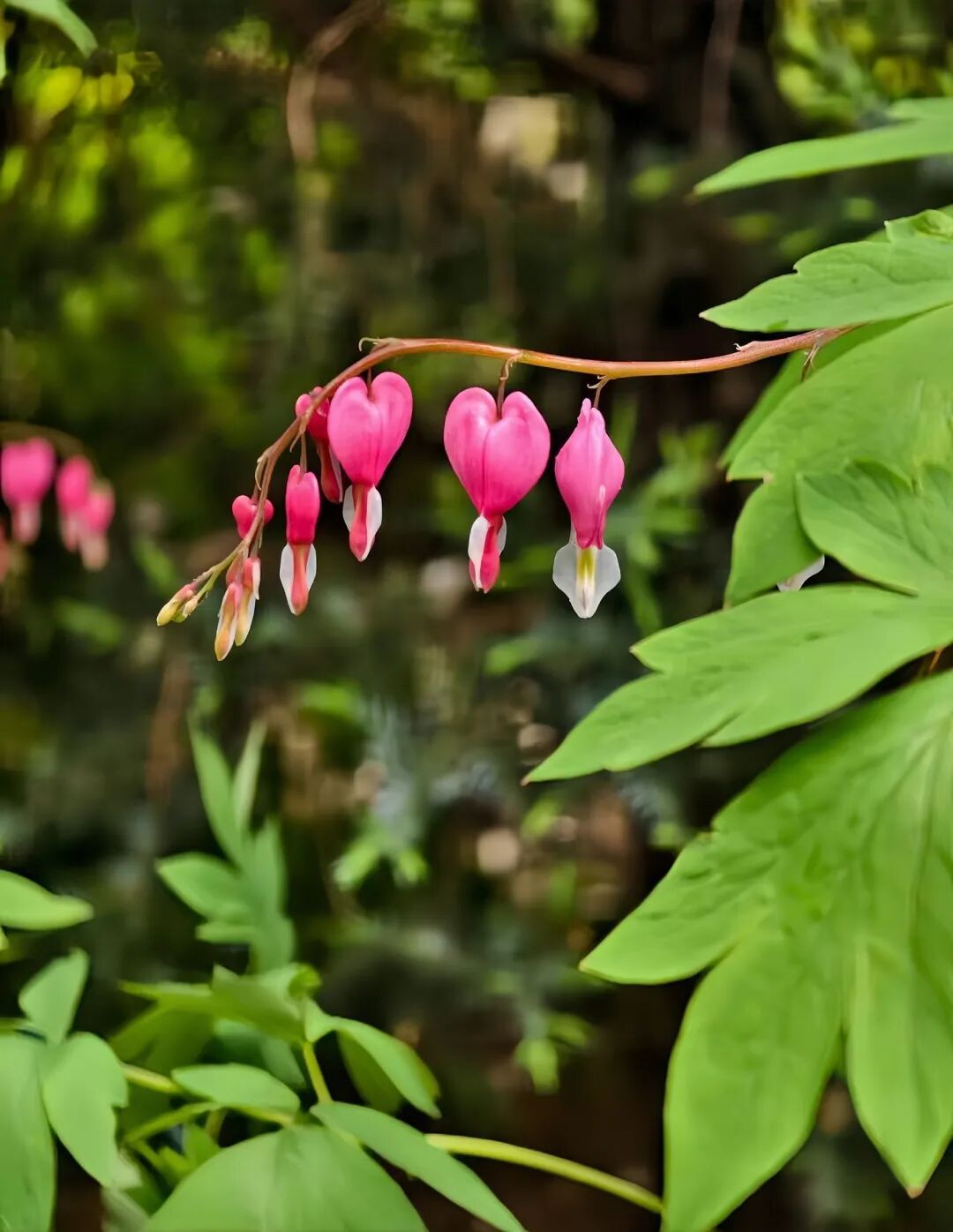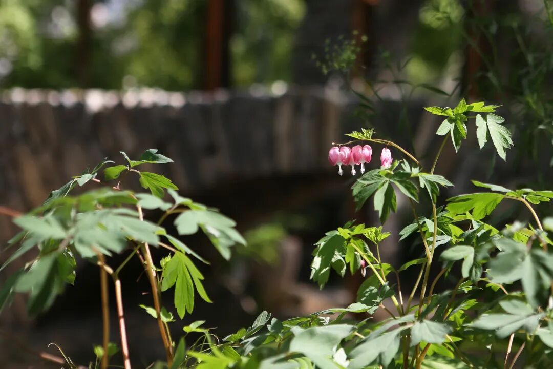 木屋花园的荷包牡丹垂挂成串,粉红色的心形花朵,下方还垂着白色透明“泪珠”,像一串串悬挂的“小心心”,因此也被叫作“滴血的心”。