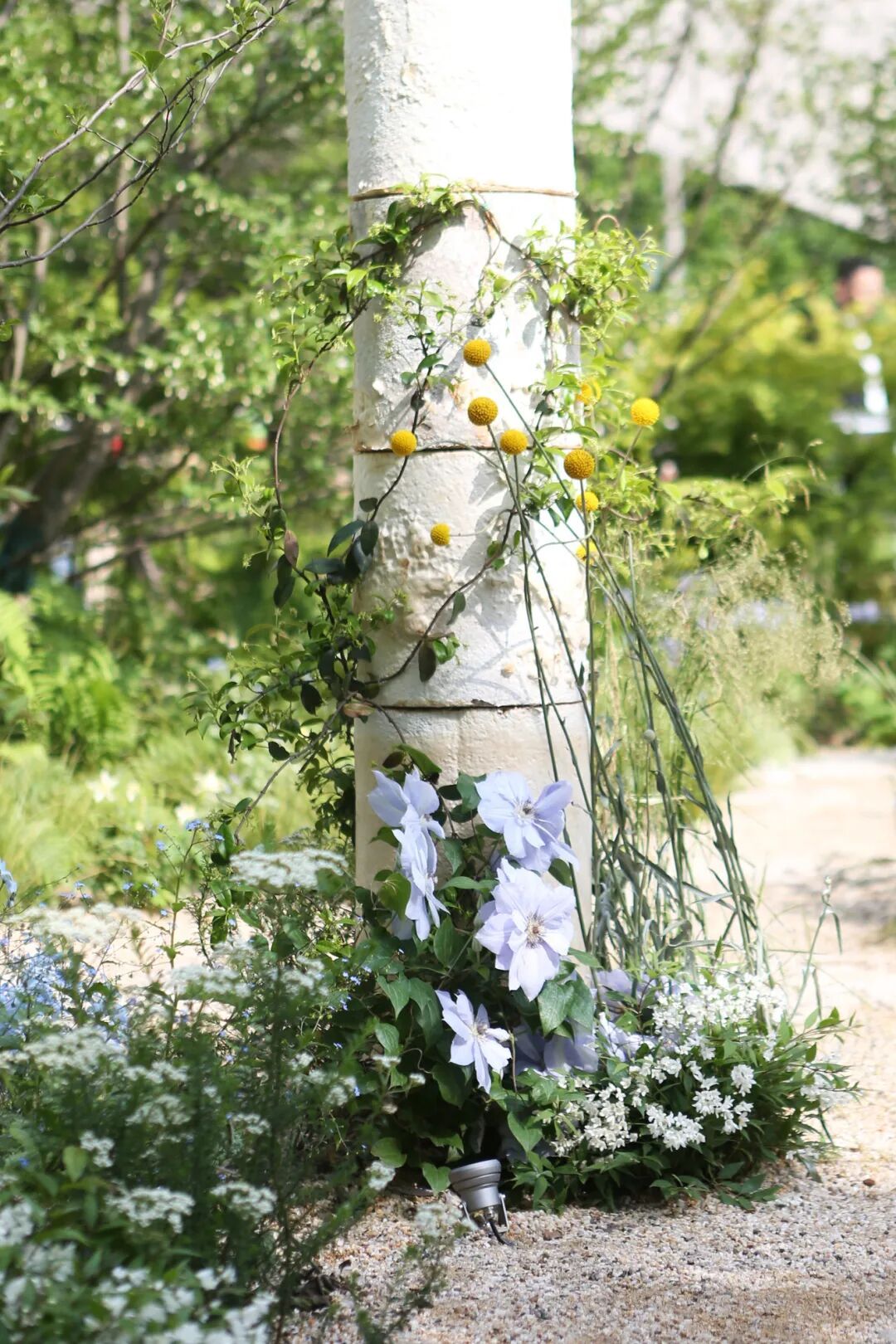 共生花园和木屋花园的铁线莲攀缘舒展,花瓣舒展若蝶翼,紫白相间,在光影里漾着轻盈灵动。