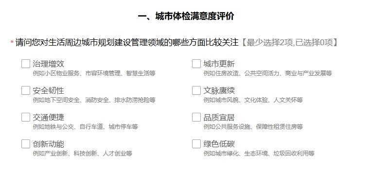 为全面了解市民对城市人居环境质量的满意度,查找城市发展建设和群众身边的突出问题和短板,上海持续开展城市体检社会调查工作。问卷涵盖城市体检满意度评价、社区调研和基本情况三大板块。其中,“城市体检满意度评价”聚焦城区和街道尺度的城市建设发展状况,比如公共服务设施、城市更新、精细化管理等方面,对不满意的领域可提出开放性改善建议。“社区调研”则聚焦住房和小区尺度,围绕住房品质、服务设施、生活环境、社区治理等方面,深入查找问题短板。(填写时间约5分钟)