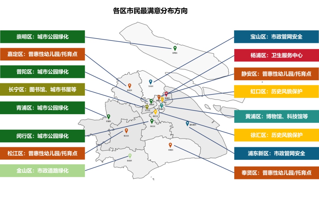 下面这份满意度调查地图中,显示了各区市民对城市建设发展中最满意的环节,快来看看吧↓