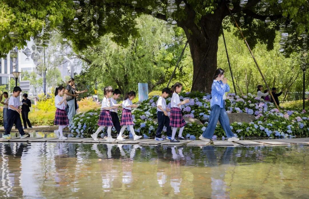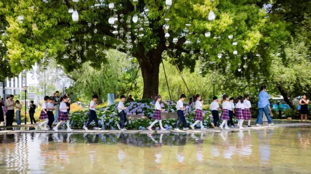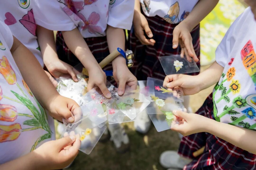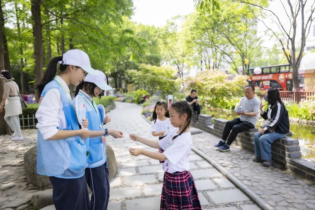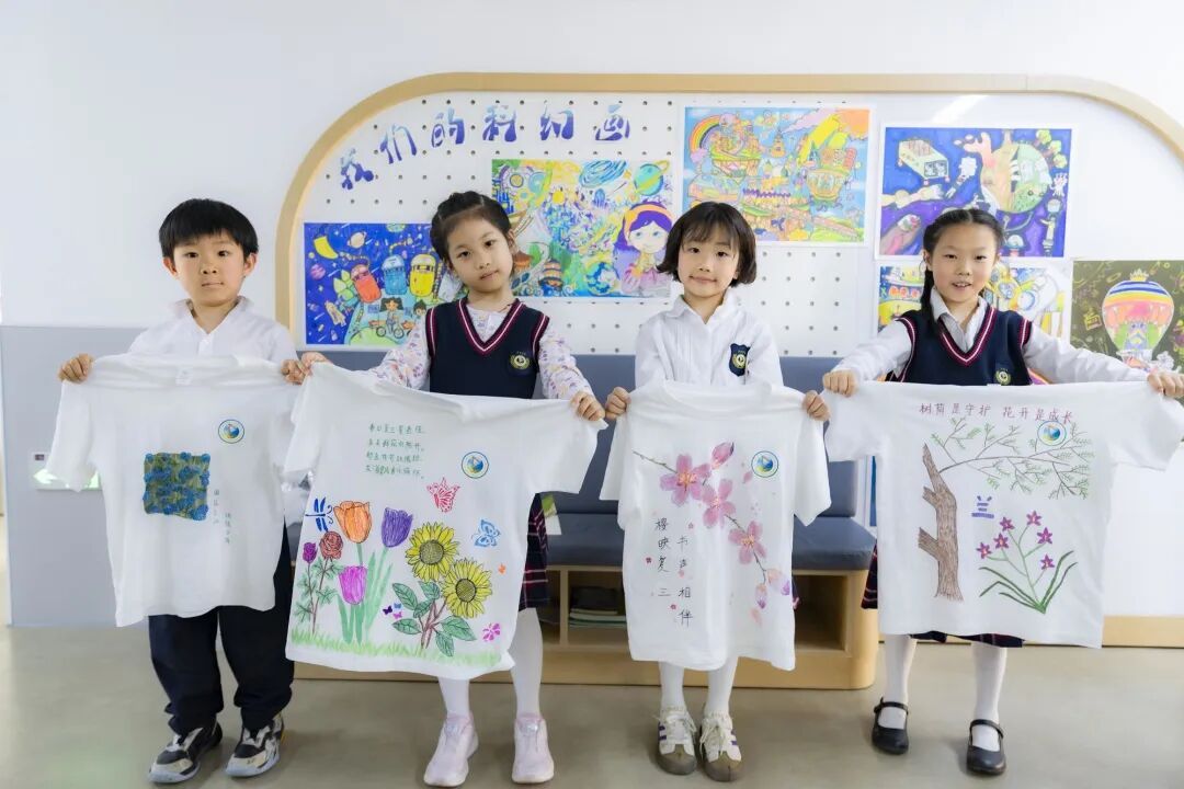 这不是一次心血来潮的“出游”。在这堂音乐课之前,孩子们早已通过科学、语文、美术等学科,把鲜花“研究”了个遍:科学课上学花的结构,语文课上读花的诗词、学赏花文明公约,自然课上观察花的生长。就连身上那一件件色彩鲜艳的T恤,也是美术课上亲手绘制的,每一件都独一无二,呈现他们对花卉节最鲜活的认知。带着这些“储备”,他们走进了花海,迎来了今天的重头戏——一堂名为“祖国的花朵·老城厢里的花园音乐会”的沉浸式课程。