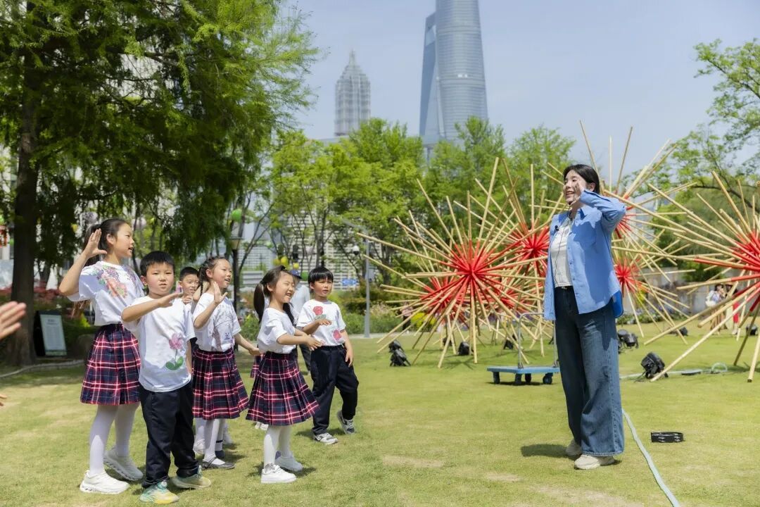 绿地上,鸟哨、沙锤等小乐器纷纷加入:春风吹拂树叶的沙沙声、小鸟灵动的啁啾声、小青蛙的呱呱鸣叫,在孩子们手中一一还原。随后,师生唱响《祖国的花朵》,完成了一场情景交融的沉浸式歌唱。