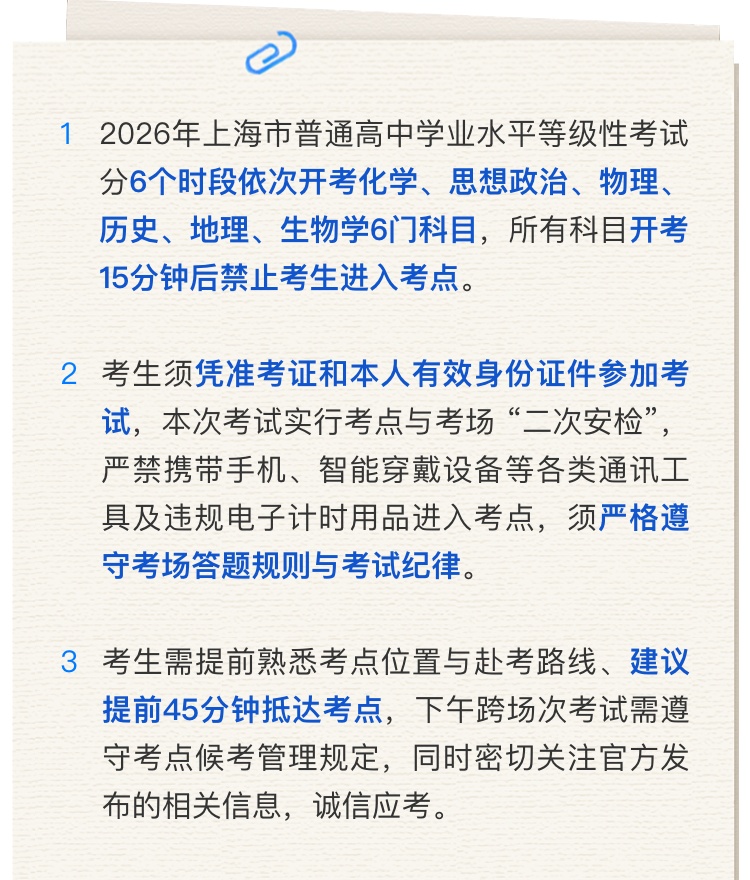 为确保考生顺利参加考试,上海市教育考试院提醒考生: 1.考生须凭准考证和本人有效身份证件(含居民身份证,有照片的社保卡、驾驶证、护照、军人证)参加考试。请仔细阅读准考证上的说明和要求,妥善保管好准考证,不得在准考证上书写任何内容。 2.等级考期间适逢“五一”假期和工作日,请考生和家长务必提前熟悉考点所在位置及赴考路线,充分考虑考试当天的天气和交通情况,合理安排出行时间及路线,建议提前45分钟到达考点,以保证顺利应考。所有科目考试开考15分钟后禁止进入考点。 3.建议考生考前及考试期间,注意自我防护。如有水痘、肺结核等传染病情况,主动向所在学校(社会考生向区招考机构)报告,并按照各区统一安排参加考试。 4.本次考试实行考点和考场“二次安检”。进入考点时,考生须服从安排、有序入场,接受考点工作人员的安全检查。 (1)为方便快速通过安全检查,请考生携带透明文具袋并内装符合规定的考试文具等用品,尽量不要携带(穿戴)有金属配件的物品或衣物(例如金属拉链、金属皮带扣、金属发卡、带钢圈的文胸等)。建议书包不带进考点。 (2)严禁携带各种通讯工具(如手机、智能手表、智能手环、智能眼镜等具有发送或接收信息功能的设备)、录放设备、电子计时器、有数字显示屏的手表等进入考点。建议将手机等上述物品放于家中或交由送考教师、送考家长保管,或存放于考场入口处的专设手机集中管理点。申请合理便利的残疾考生所携带的助听器、人工耳蜗、拐杖、轮椅等可经检查后正常通过安检。 (3)进入考场前,考生须配合监考员再次进行安全检查、验证准考证和身份证件。进入考场后,应按座位号对号入座,将身份证件放在课桌左上角,以便监考员核验。开考前,考生须核对桌贴和准考证信息是否一致,并根据监考员指令,将准考证收入口袋(无口袋的放入课桌抽屉),整场考试期间不得取出准考证。 5.开考信号发出后,考生方可开始答题;考试结束信号发出后,应当立即停笔并停止答题。考试结束信号发出后继续答题的将按照考试违规进行处理。 6.请考生仔细阅读《上海市普通高中学业水平考试笔试科目考试考场规则》(附件1-附文末)和《上海市普通高中学业水平考试考生答题注意事项》(附件2-附文末),诚信考试。警惕网上虚假信息,保护自身利益。如有违规、违法行为将参照《国家教育考试违规处理办法》(教育部令第33号)(摘要)或《中华人民共和国刑法修正案(九)》(摘要)严肃处理。 7.考生须密切关注上海市教育考试院“上海招考热线”网站、“上海市教育考试院”微信公众号、就读学校和区招考机构发布的相关信息。 8.考试结束,考生应听从考点指挥,带好随身物品,有序快速离开考场。由于等级考下午开考两场,涉及中途换场,需要考生特别注意: (1)仅参加下午第一场考试的考生,由考点工作人员引导离开考点,不在考点滞留。 (2)下午两场考试都参加的考生,由考点工作人员引导至候考室等候。考生候考期间,原则上不得离开考点,若中途离开考点,需重新进行“二次安检”入场。 (3)仅参加下午第二场考试的考生,完成“二次安检”后,进入考场。 9.送考家长在考点周边应避免聚集,服从考点工作人员和警务人员指挥,考试期间应确保手机畅通。 感谢考生与家长们的理解和支持!祝愿广大考生考出好成绩! 点击“阅读原文”了解详情 送你一个新闻盲盒 快来打开看看吧