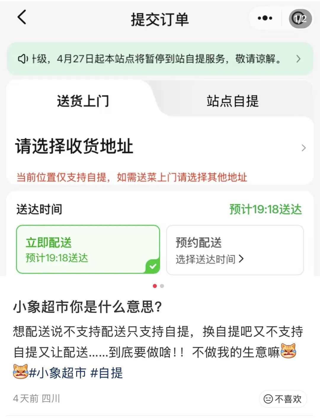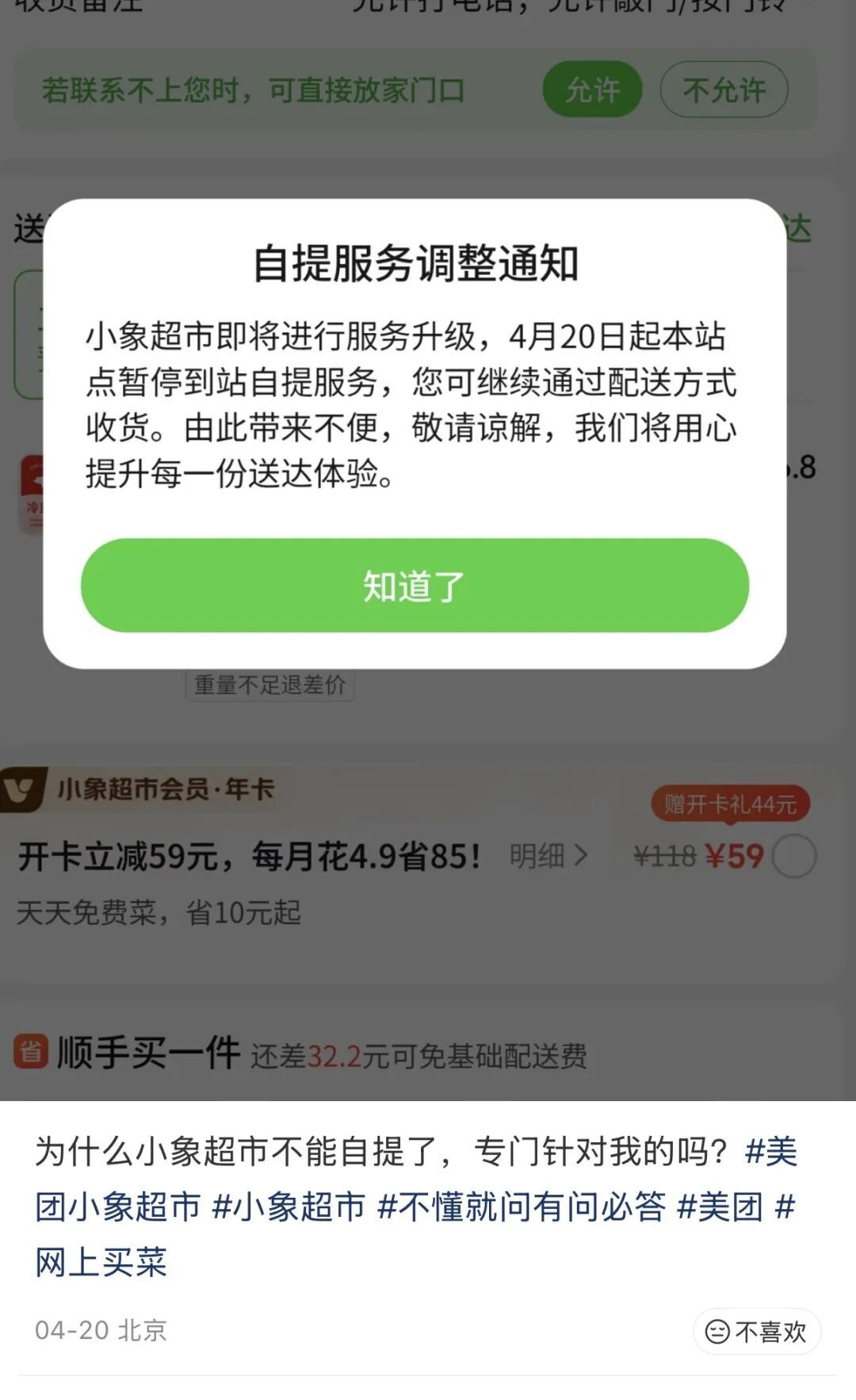 一些北京、广东、上海等地的用户在社交平台上称,自4月20日起,原本就近可达的小象超市自提站点陆续暂停服务,以往购买一瓶酱油、一袋纸巾等小额商品时,通过自提免配送费的便利不再享有。