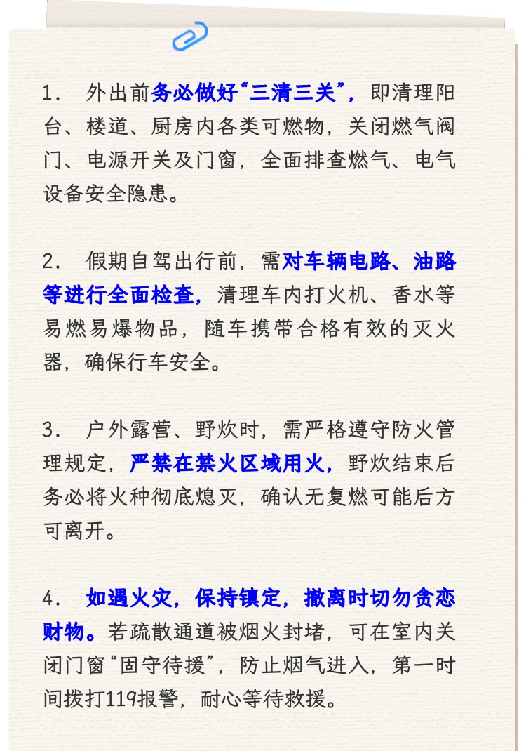 图片来源:千图网 据市消防救援局介绍,“五一”假期期间,各类用火、用电、用气行为显著增多,消防安全风险随之攀升。为切实保障广大群众生命财产安全,现发布消防安全提示。 点击“划重点”极速浏览↓↓↓ 1 外出前务必做好“三清三关”,即清理阳台、楼道、厨房内各类可燃物,关闭燃气阀门、电源开关及门窗,全面排查燃气、电气设备安全隐患。 2 家庭用电切勿私拉乱接电线、超负荷用电,各类充电设备需远离被褥、衣物等可燃物,充电完成后及时拔除插头,严防电气火灾发生。 3 假期自驾出行前,需对车辆电路、油路等进行全面检查,清理车内打火机、香水等易燃易爆物品,随车携带合格有效的灭火器,确保行车安全。 4 乘坐公共交通工具时,严禁携带汽油、酒精等易燃易爆危险品,熟悉车厢内安全出口及灭火器位置。 5 假期入住酒店、民宿,第一时间查看消防疏散示意图,确认最近的安全出口及疏散通道,便于紧急情况下快速撤离。 6 户外露营、野炊时,需严格遵守防火管理规定,严禁在禁火区域用火,野炊结束后务必将火种彻底熄灭,确认无复燃可能后方可离开。 7 前往商场、景区、影院等人员密集场所时,应主动留意现场消防安全提示,熟悉应急疏散路线,严禁占用、堵塞消防通道,不随意触碰、损坏消防设施。 8 如遇火灾,保持镇定,撤离时切勿贪恋财物。若疏散通道被烟火封堵,可在室内关闭门窗“固守待援”,防止烟气进入,第一时间拨打119报警,耐心等待救援。 9 大型活动、集市举办方需严格履行消防安全主体责任,提前开展消防安全检查,合理规划疏散通道和安全出口,配备足够数量的消防器材,安排专人负责现场消防安全管理和应急值守。 10 假期结束复工复产前,各企业、商户应对生产车间、办公区域、仓库等重点部位开展全面消防安全排查,清理堆积的杂物及易燃易爆物品,检查电气设备、消防设施运行状况,及时整改各类安全隐患。 送你一个新闻盲盒 快来打开看看吧