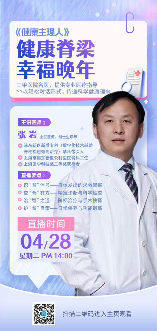 脊柱健康,直接关系到我们生活的行动自由与生活质量,腰酸背痛、腿脚发麻看似小毛病,却可能是脊柱发出的“求救信号”。今天,我们特别邀请到了浦东新区新质专科(数字化技术辅助脊柱疾患微创治疗)学科带头人、上海市浦东新区公利医院骨科主任张岩,围绕脊椎方面的问题为大家答疑解惑。
