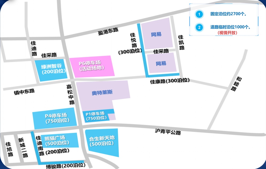 商场内部及周边停车场包含商场P1(1号门)、P4(沪青平公路/嘉松中路路口西侧)停车场以及合生新天地、熊猫广场、绿洲智谷停车场。注意:商场P6、P2停车场在4月28日活动期间暂停使用,警方将视情开放周边道路临时停车。