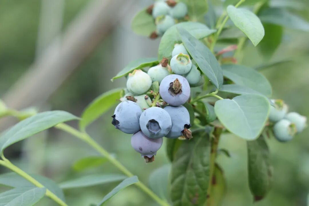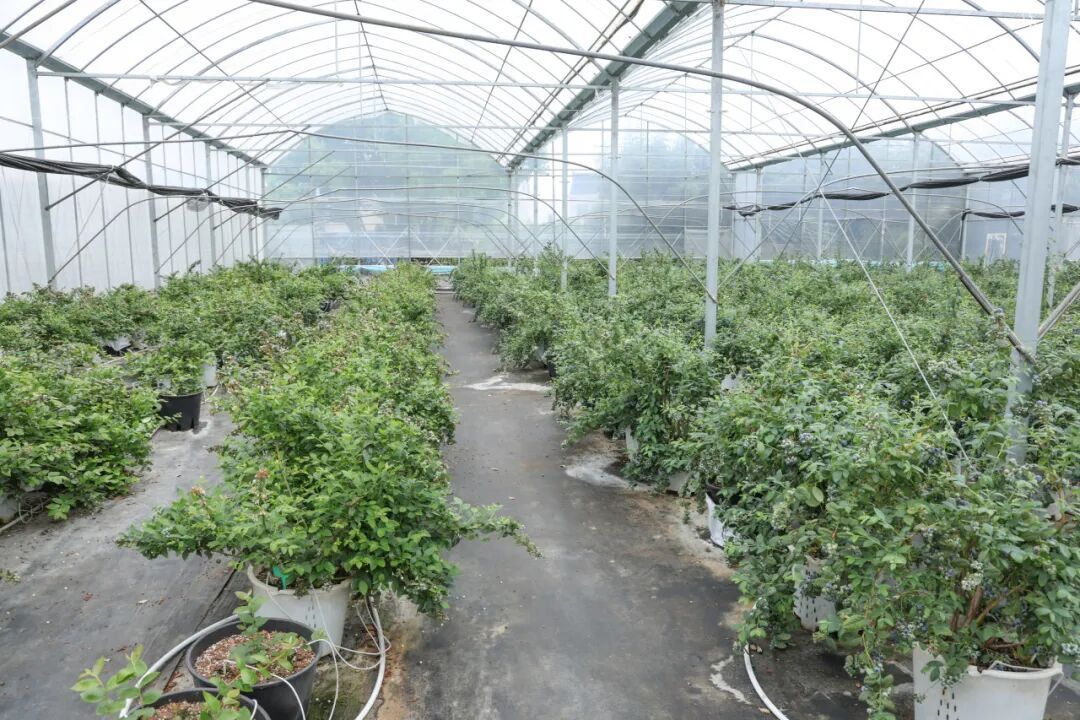再往里走,来到了蓝莓采摘区,可以看到一株株蓝莓苗排列整齐,枝叶翠绿,枝干上一簇簇蓝莓一颗挨着一颗,外皮上裹着一层“天然果粉”,果实颗颗饱满,光是看着就让人垂涎欲滴。