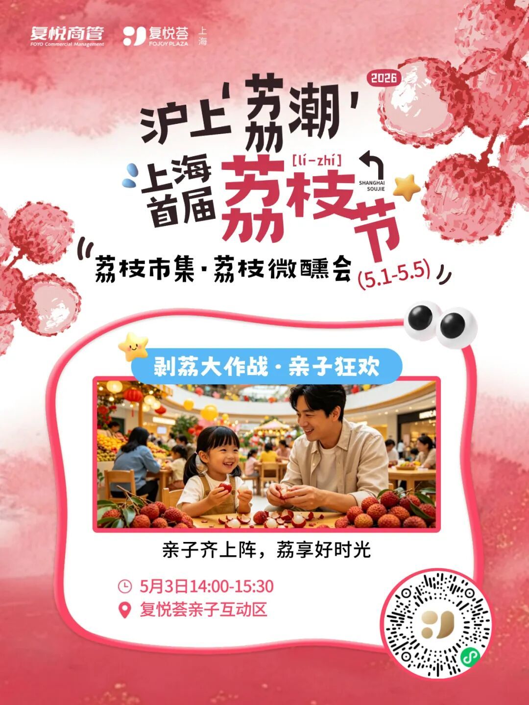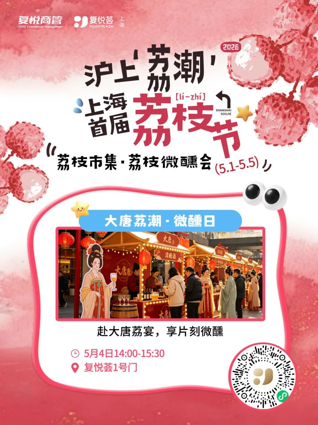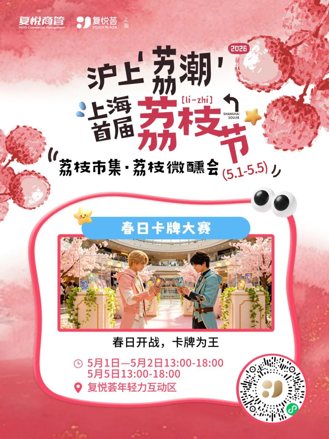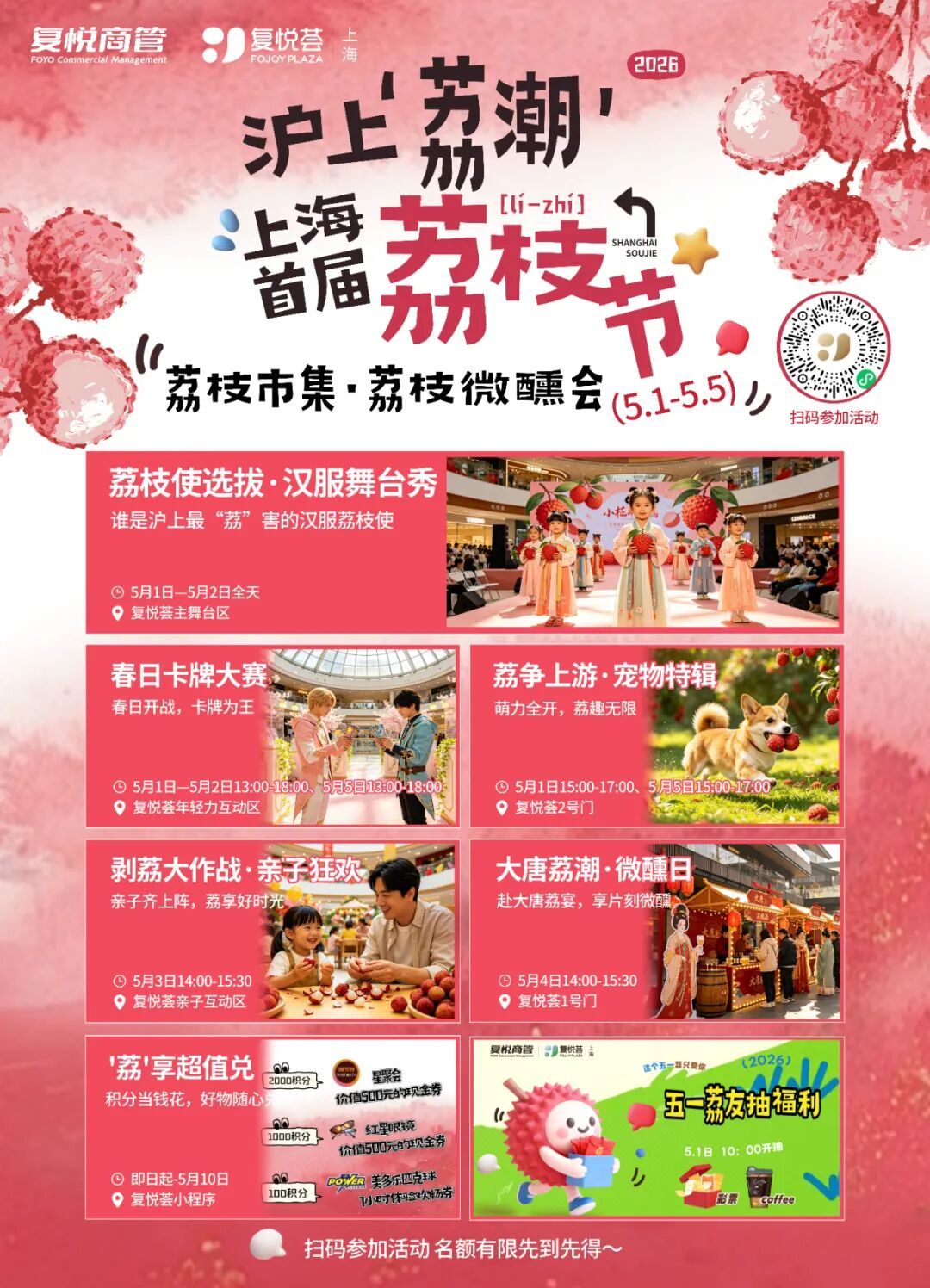 五一假期即将来临,上海复悦荟正式启动“沪上荔潮・上海首届荔枝节”主题系列活动,以荔枝为创意IP,串联国风演绎、潮玩竞技、亲子互动、萌宠社交、微醺市集等多元场景,为市民打造一场集视觉、味觉、互动体验于一体的沉浸式假日狂欢,解锁消费市场春日新活力。 本次荔枝节活动时间为5月1日至5月5日,五大特色主题活动轮番上演,覆盖全年龄段消费群体。国风爱好者可参与荔枝使选拔与汉服舞台秀,5月1日至2日,身着汉服的小模特们衣袂翩跹,在现场角逐“沪上最‘荔’害汉服荔枝使”称号。 年轻潮玩群体不容错过春日卡牌大赛,5月1日-2日、5月5日,年轻力互动区将开启巅峰对决,卡牌爱好者以牌会友,点燃竞技热情;“荔争上游・宠物特辑”于5月1日、5日下午温情开启,趣味互动让市民在假日里感受毛孩子带来的治愈与欢乐。 5月3日的剥荔大作战・亲子狂欢,将在亲子互动区打造全家协作的甜蜜挑战,定格温馨时光;“大唐荔潮・微醺日”则于5月4日登场,古风市集搭配荔枝特调,让市民沉浸式体验盛唐荔宴的氛围感,在微醺中感受传统文化与潮流生活的碰撞。 活动期间,商场同步推出多重福利加码。会员可参与超值兑活动,即日起至5月10日,用商场积分即可兑换星聚会体验券、红星眼镜产品、美多乐匹克球体验券等超值好礼,积分直接当钱花;5月1日上午10点,“五一荔友抽福利”准时开抢,幸运福利彩票、咖啡券等惊喜福利限量放送;B1楼漾neo汤泉还推出荔枝畅吃体验,让市民在休闲放松的同时,解锁荔枝自由的舌尖快乐。