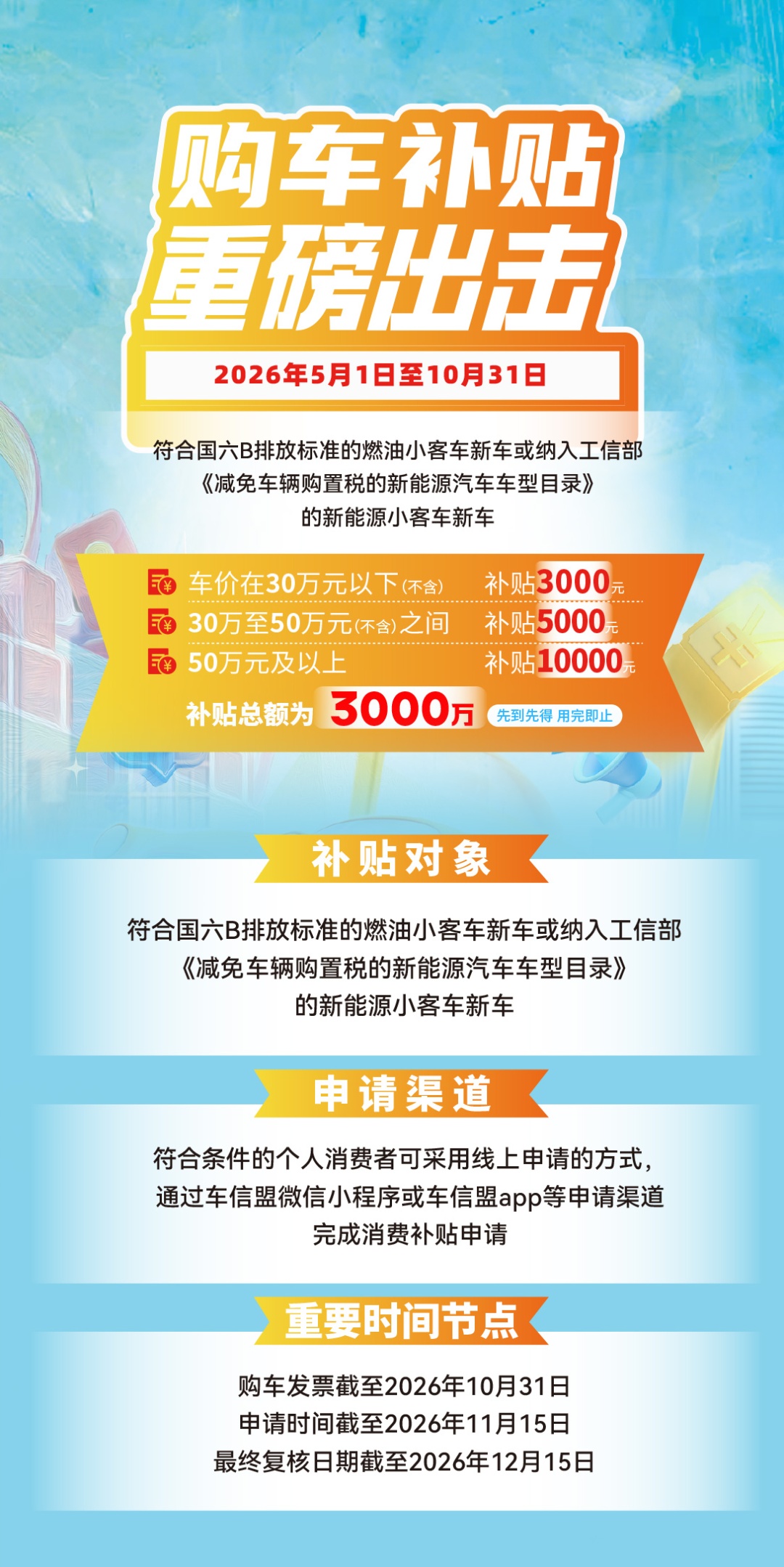 据区商务委消息,本区2026年汽车促消费补贴活动即将启动。对于5月1日至10月31日期间,在区内购置新车的个人消费者,每辆车可享受3000元至10000元的购车补贴。购车补贴采取先购置后申请方式,先到先得、用完即止,总金额为3000万元。所购车辆须登记为“非营运”性质,且应为符合国六B排放标准的燃油小客车新车或新能源小客车新车。
