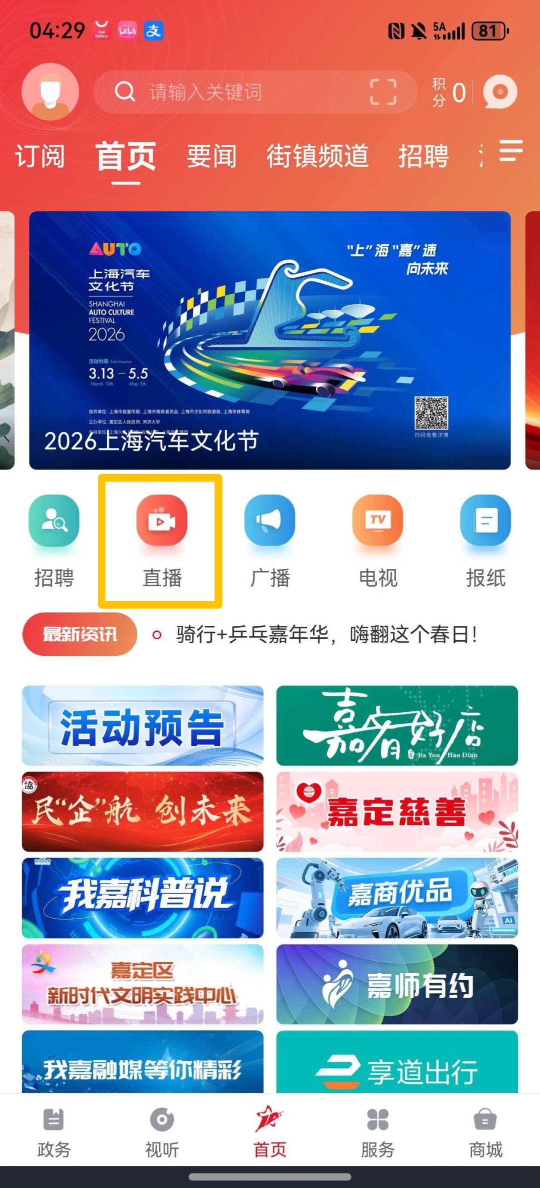 在“上海嘉定”APP首页中,点击“直播”按钮,可以回看“健康有道”往期节目。