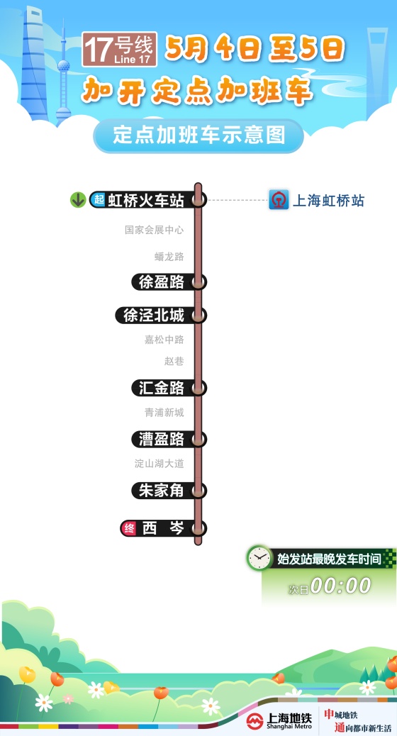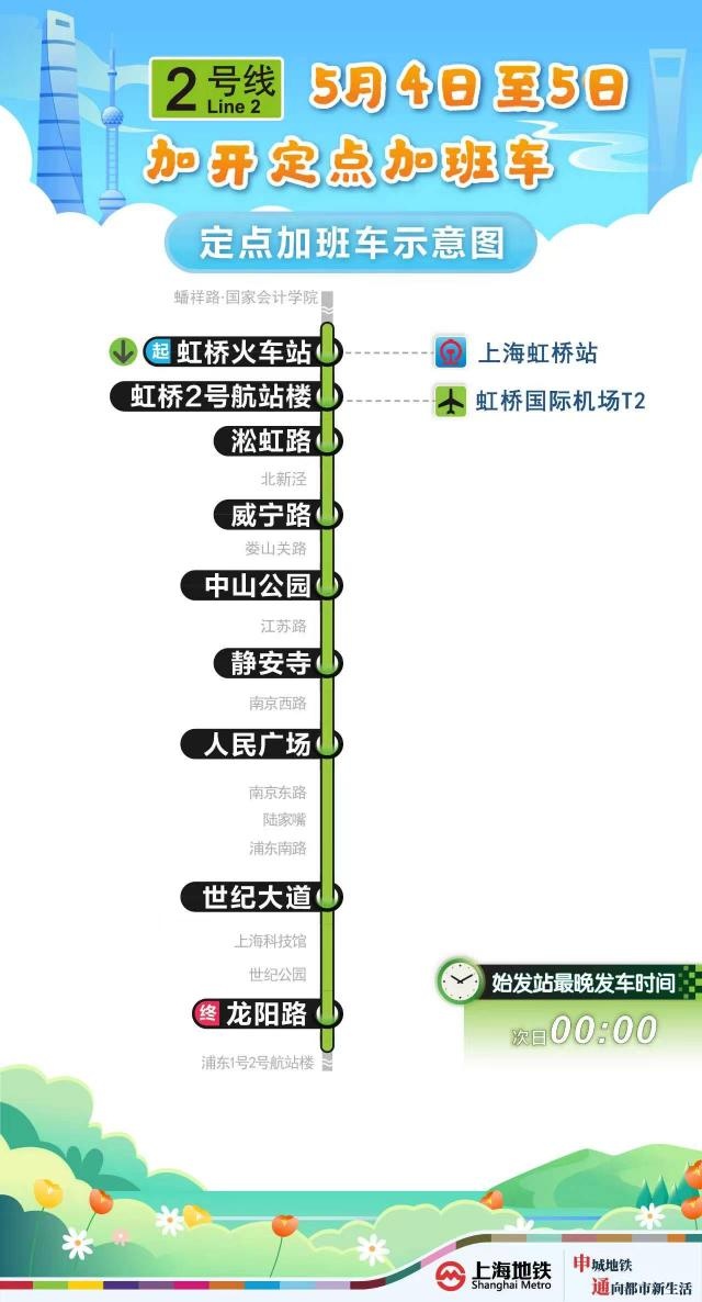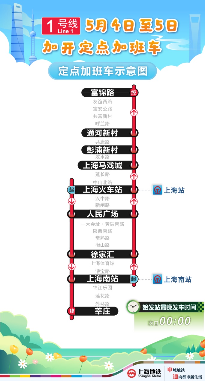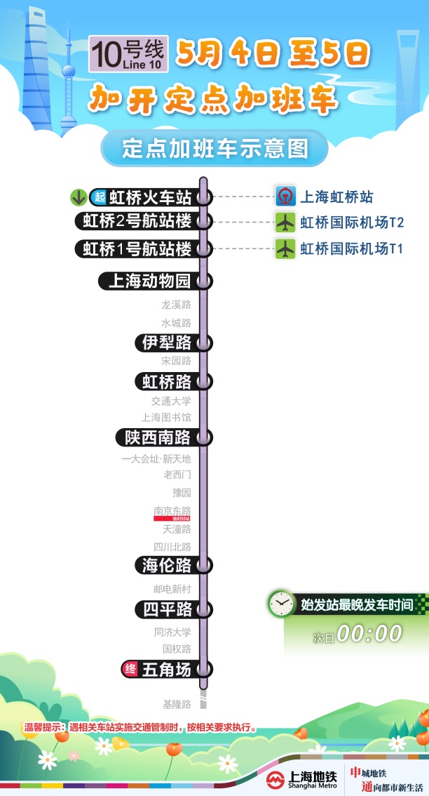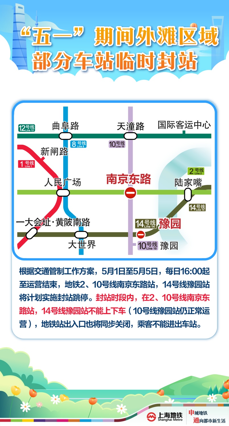 2026年“五一”劳动节假期为5月1日至5月5日,共计5天。各大交通枢纽抵离沪客流集中,各类赛事、商业、展会活动密集举办。上海地铁通过加大运力供给、夜间延时运营、加开定点加班车、提升保驾等级等多项措施,保证节日出行的您来去平安顺畅。 “五一”期间出行客流呈现头尾高峰明显、高峰持续时间延长等特点,热点商圈及外滩周边等重点区域休闲客流将显著增加。预计节前最后一个工作日,4月30日当天,全网客流将超1250万人次,长假期间日均客流约806万人次。 根据计划: ● 4月30日至5月2日,地铁1、7、8、9、10、13号线将实施延时运营,六条延时运营线路末班车发车时间均过“0点”; ● 5月4日至5日(即返程高峰期),地铁1、2、10、17号线将增开定点加班车; ● 5月1日至5月5日的每日16:00至运营结束,地铁2、10号线南京东路站,14号线豫园站计划实施封站跳停(10号线豫园站仍正常运营)。 配合交通管制 5月1日至5月5日每日16:00起 2、10号线南京东路站及14号线豫园站封站 根据交通管制工作方案,5月1日至5月5日,每日16:00起至运营结束,地铁2、10号线南京东路站,14号线豫园站将计划实施封站跳停。封站时段内,在2、10号线南京东路站,14号线豫园站不能上下车(10号线豫园站仍正常运营),地铁站出入口也将同步关闭,乘客不能进出车站。届时,车站将加强站内广播宣传、导向设置、站台站厅秩序维护等工作。 需要提醒乘客的是,14号线豫园站临时封站期间,10号线豫园站仍正常运营。同时,2、10号线南京东路站,14号线豫园站的临时封站时间或将根据相关部门要求有所调整,届时请现场乘客配合车站工作人员指引通行。 此次“五一”实施封站,要提醒在14号线豫园站、2/10号线南京东路站使用行李寄存柜的乘客,封站期间无法存取行李,请注意封站时间,合理安排行李存取时间。 全面提升保驾等级 多线路加大运力供给 此次“五一”期间,上海地铁全网络将提升保驾等级,为运营现场“上保险”。为满足乘客出行需要,节前最后一个工作日4月30日,上海地铁2、6、9、16号线加大运力供给,大客流时段的运能配置将有所提升;而小长假期间,上海地铁2、10、16及17号线也将针对性的在重点区段和时段提升运能,满足乘客节日出行需求。 4月30日至5月2日,1、7、8、9、10、13号线延时运营 长假期间市内大型商圈、热门景点等休闲娱乐出行客流需求将进一步增加,夜高峰时间将有所延长,为满足乘客节日出行需求,4月30日至5月2日,地铁1、7、8、9、10、13号线将连续3天实施延时运营,所有六条延时运营线路延时末班车始发时间均至次日0点,延时期间,各换乘站实施自然换乘,请需要换乘的乘客注意换乘相关线路的末班车时间。 疏散交通枢纽夜间返程客流 5月4日至5日1、2、10、17号线加开定点加班车 为做好节日返程高峰期虹桥火车站夜间列车集中到达大客流疏散工作,5月4日至5日,上海地铁1、2、10、17号线加开定点加班车至次日0点,定点加开列车途经换乘站均暂停换乘服务。同时,地铁运营方还将密切关注虹桥枢纽夜间客流情况,根据现场客流需求或将进一步延长定点加班车开行时间。 1号线上海南站站往富锦路站方向: 在上海南站站末班车后加开定点加班车运行至富锦路站,加班车停靠上海南站站、徐家汇站、人民广场站、上海火车站站、上海马戏城站、彭浦新村站、通河新村站、富锦路站(终点站),其余车站不停靠。停靠车站中,上海南站站(始发站)、上海火车站站可上下客,其余车站只下不上。 1号线上海火车站站往莘庄站方向: 在上海火车站站末班车后加开定点加班车运行至莘庄站,加班车停靠上海火车站站、人民广场站、徐家汇站、上海南站站、莘庄站(终点站),其余车站不停靠。停靠车站中,上海火车站站(始发站)、上海南站站可上下客,其余车站只下不上。 2号线虹桥火车站站往龙阳路站方向: 2号线在虹桥火车站常态定点加班车的基础上加开定点加班车。加班车沿途停靠虹桥火车站站、虹桥2号航站楼站、淞虹路站、威宁路站、中山公园站、静安寺站、人民广场站、世纪大道站、龙阳路站(终到站),其余车站不停靠。停靠车站中,虹桥火车站站(始发站),虹桥2号航站楼站可上下客,其余车站只下不上,途经换乘站不可换乘。 10号线虹桥火车站站往五角场站方向: 10号线在虹桥火车站站常态定点加班车后加开定点加班车,加班车停靠虹桥火车站站、虹桥2号航站楼站、虹桥1号航站楼站、上海动物园站、伊犁路站、虹桥路站、陕西南路站、海伦路站、四平路站、五角场站(终点站),其余车站不停靠。停靠车站中,虹桥火车站站(始发站),虹桥2号航站楼站、虹桥1号航站楼站可上下客,其余车站只下不上。 17号线虹桥火车站站往朱家角站方向: 17号线在虹桥火车站站下行末班车后加开定点加班车。加班车沿途停靠虹桥火车站站、徐盈路站、徐泾北城站、汇金路站、漕盈路站、朱家角站、西岑站(终点站),其余车站不停靠。停靠车站中,虹桥火车站站(始发站)可上客,其余车站只下不上。 确保通行安全重点大客流车站将视情限流 此次“五一”小长假期间,上海地铁还将重点关注交通枢纽、集散地车站。同时,在换乘枢纽站、热门旅游景点周边车站以及商圈周边等重点车站,将加强信息沟通,主动掌握客流动态,并增加重点车站的服务人员及志愿者,为乘客提供现场引导和帮助,保障乘客出行顺畅。 