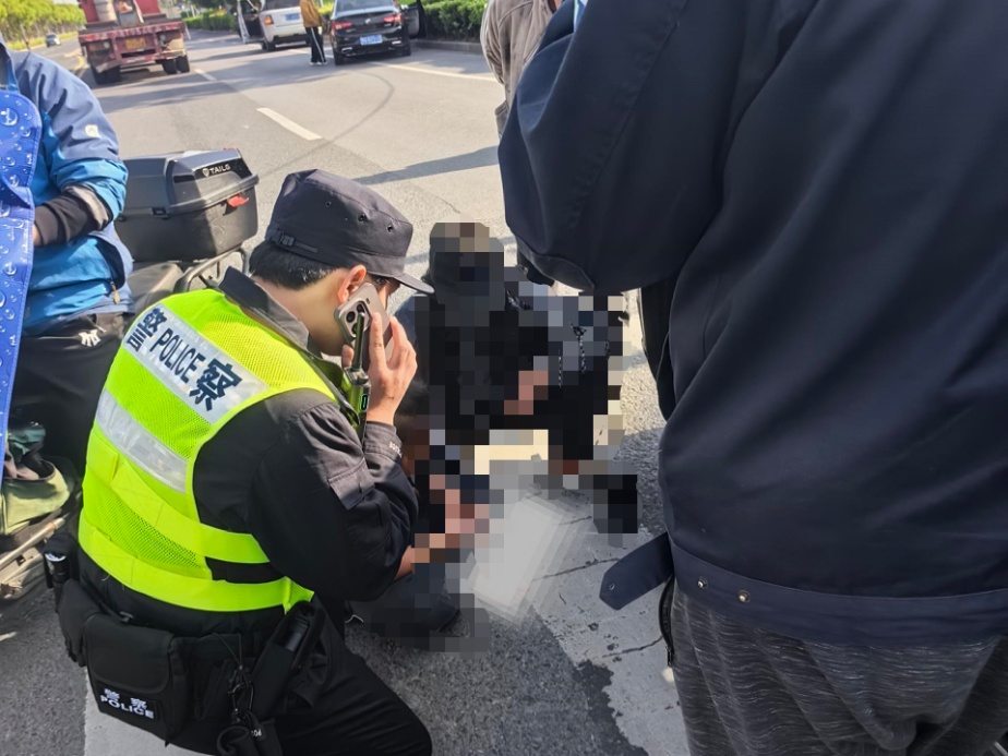 4月18日16时许,浦东公安分局航头派出所民警倪陈涵驾驶警车前往辖区某市场处理一起警情。当行驶至航头镇航鹤路与航定路交叉口时,倪陈涵听到哭喊声。循声望去,他发现一名女童被车辆撞倒,疑似右腿被卡在车辆左前轮下方。倪陈涵立刻靠边停车,第一时间向派出所报备突发情况。