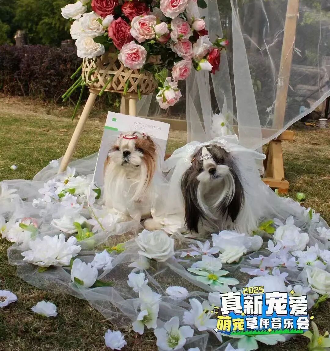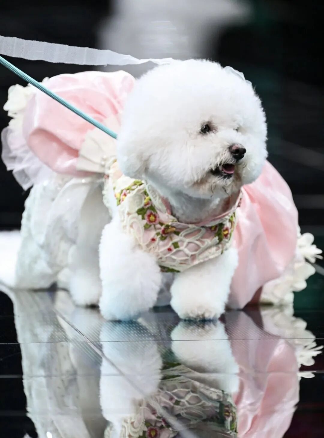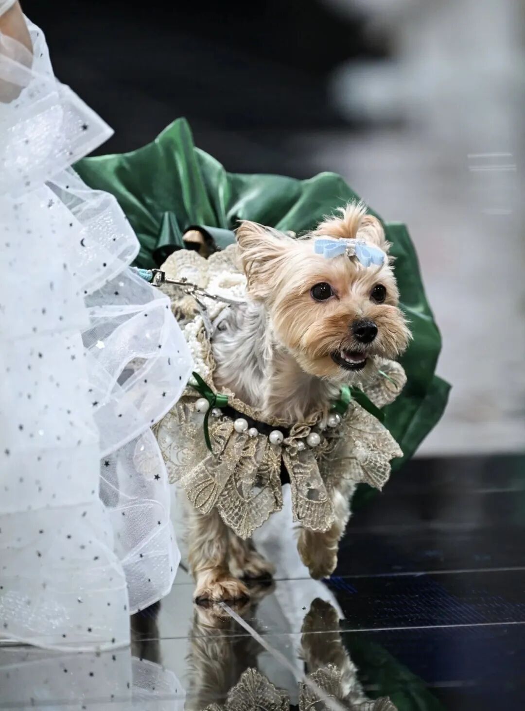 宠物模特身着宠物高定服装在主人的带领下依次登场,现场上演公园时装秀。