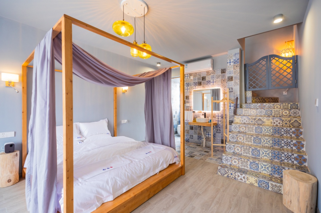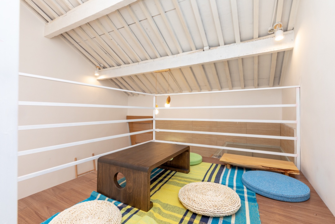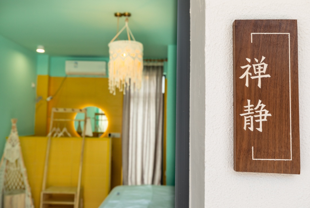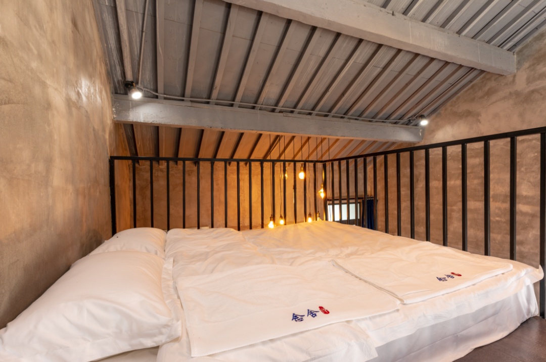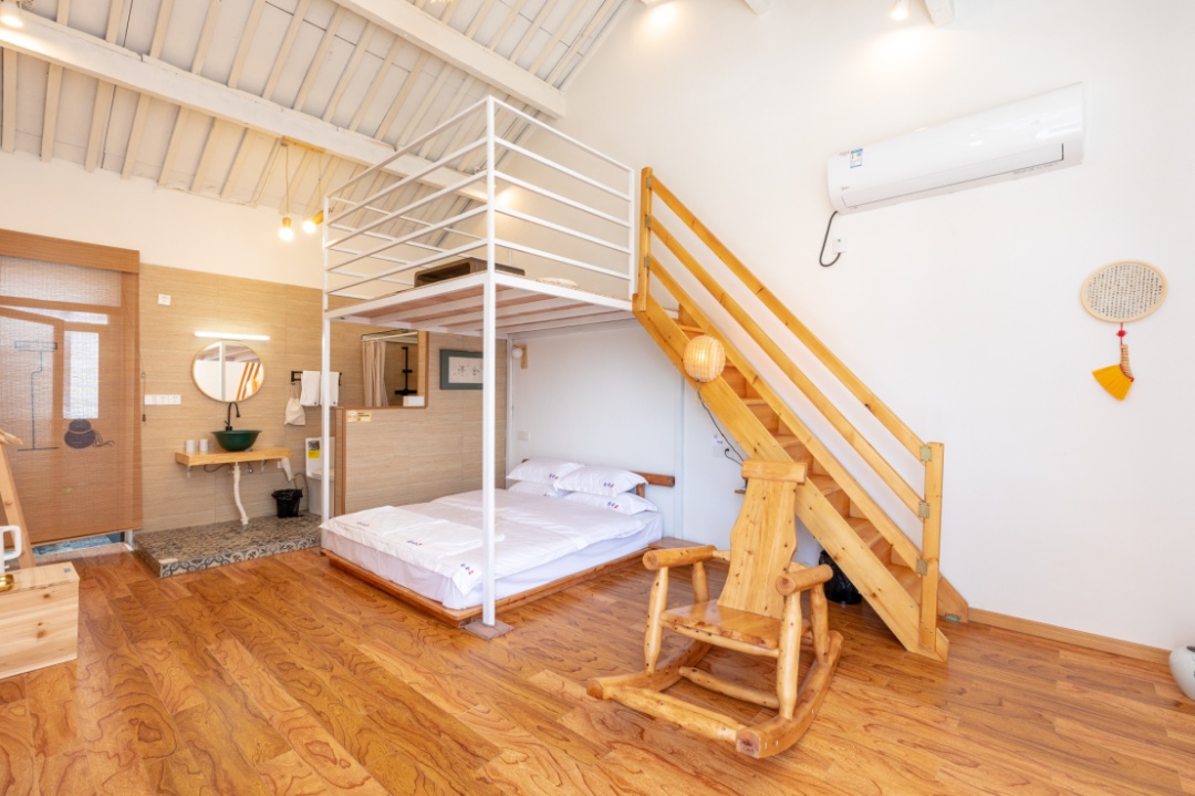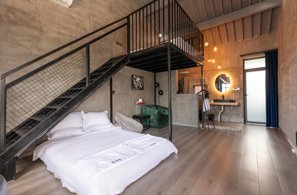 房间内,才是别有洞天。“禅静”“悟近”是一二层中间的客房,“悟近”“空也”和“修信”“念心”分别位于楼上楼下的左右两侧,均是双层设计。有意思的是,左右两侧房间内,都有楼梯连通一二楼上下两层房间,中间有大门可以开关,如果是一个大家庭居住,敞开大门来往十分方便;如果是单独的客人,关上大门也能保护隐私。
