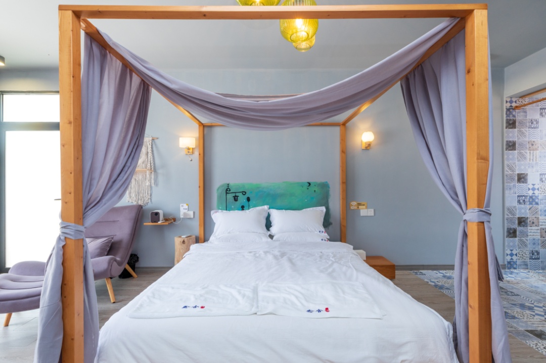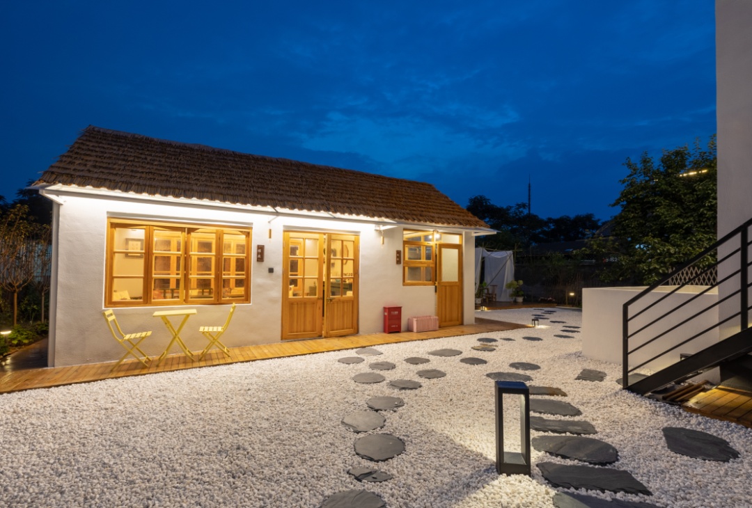 民宿的庭院很大,主人还在院中建造了一座休息平台,傍晚时分,搭上飘逸的幔帐,放上几张桌椅,观月望星,茶话人生,悠哉乐哉。民宿还有烧烤设备可以租赁,晚上灯光亮起,一起围火烤肉,乐趣多多。