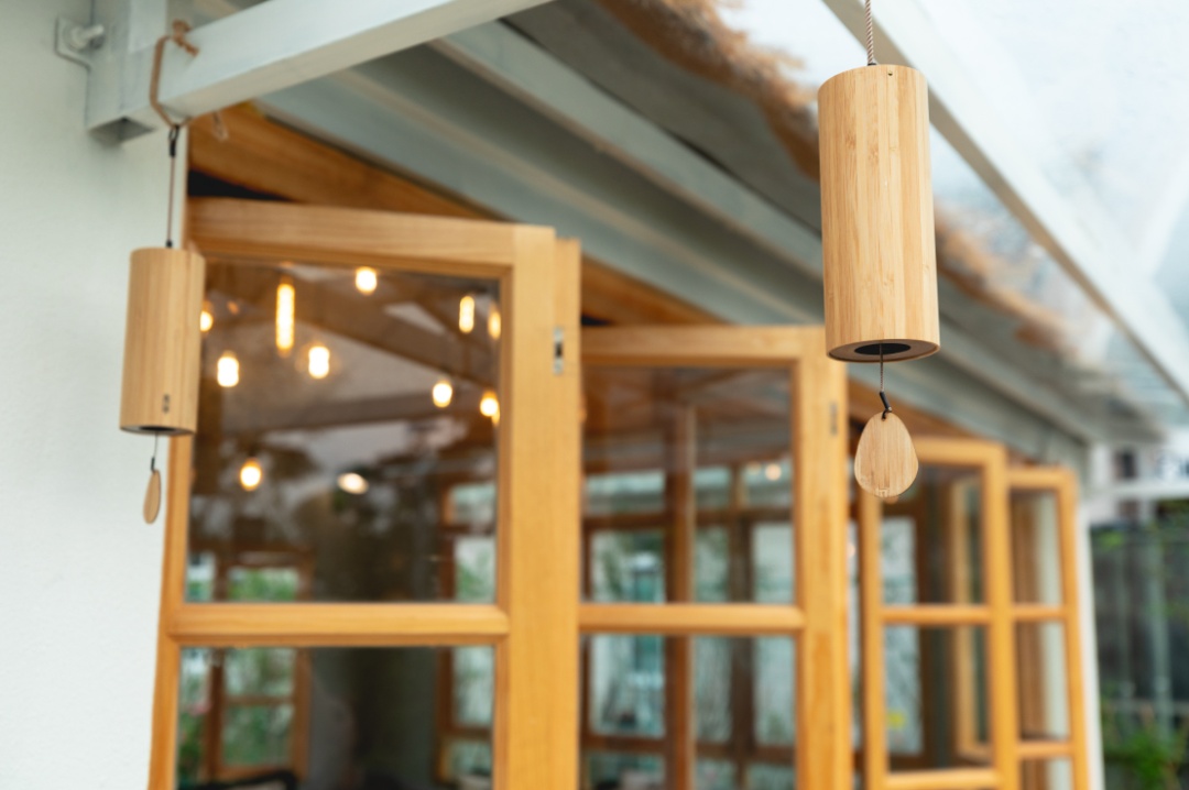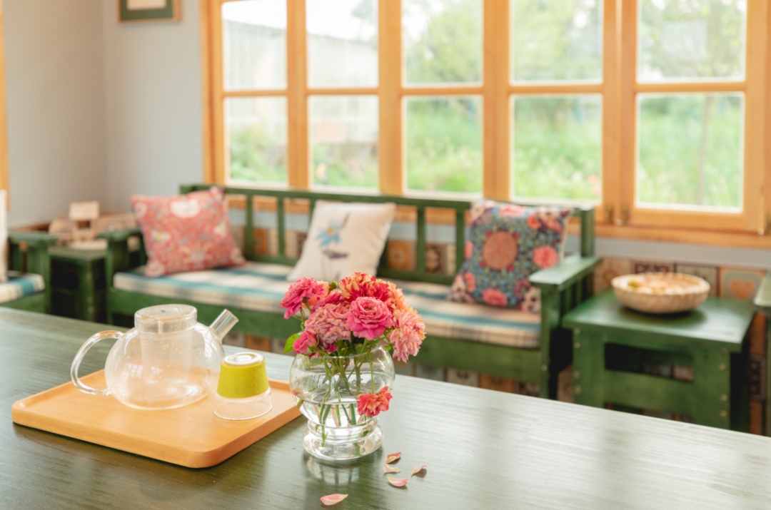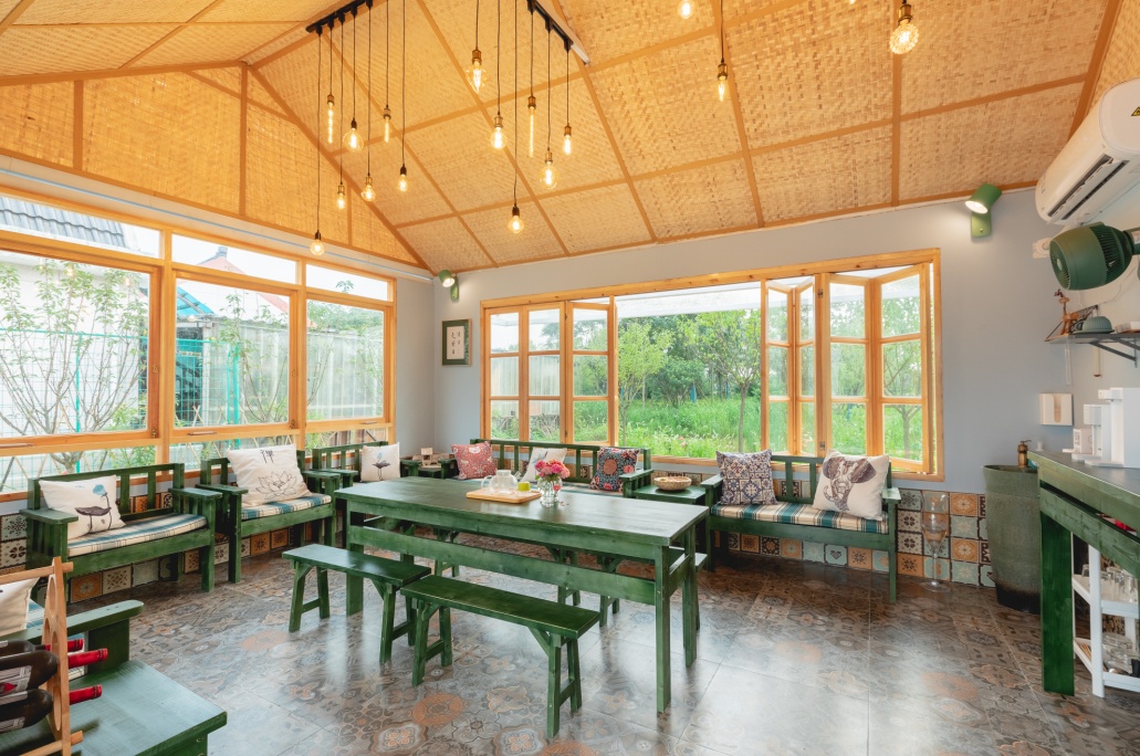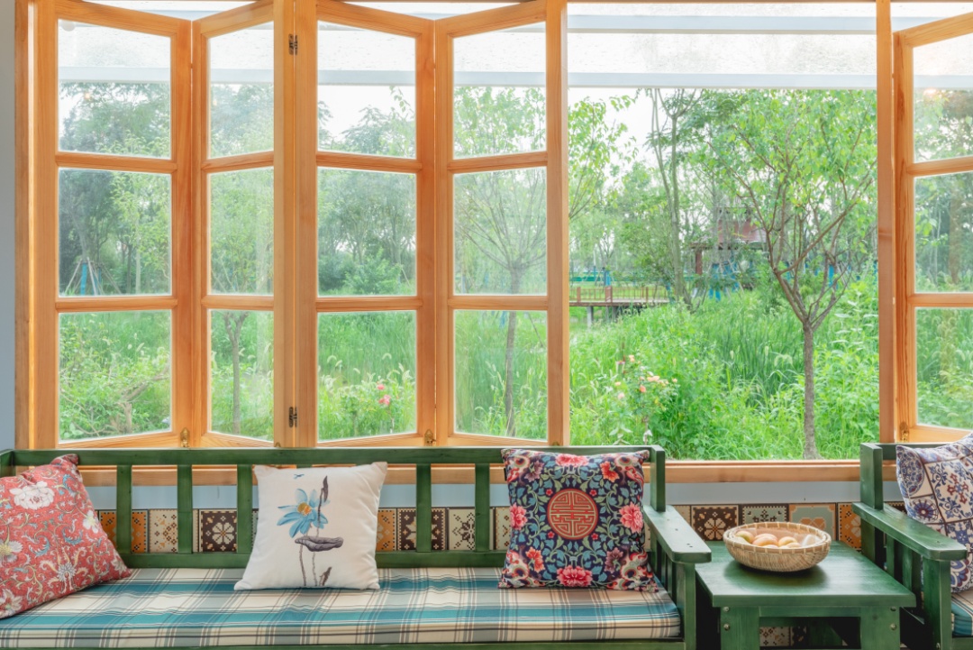 “念舍禅”民宿的活动室里,桌椅、沙发为明媚的浅绿色,地面则选择了具有深色花纹的地砖,营造出一股浓浓的田园气息。房间三面墙都被装上了超大的玻璃窗,待到微风起来的时候,打开折叠窗扇,流动的空气穿过室内,即使在炎热的夏季,也能带来丝丝清凉。推开窗户,就是一座乡村公园,萋萋芦苇、绚丽花木、雅致桥亭……自然美景跃然眼前。