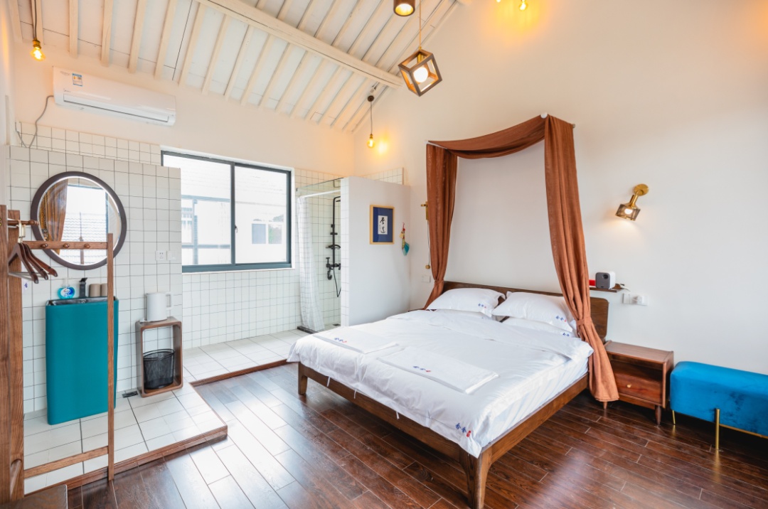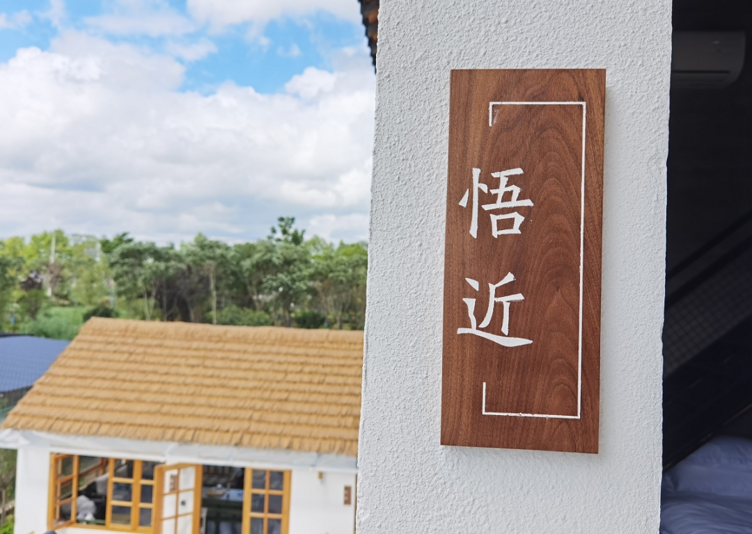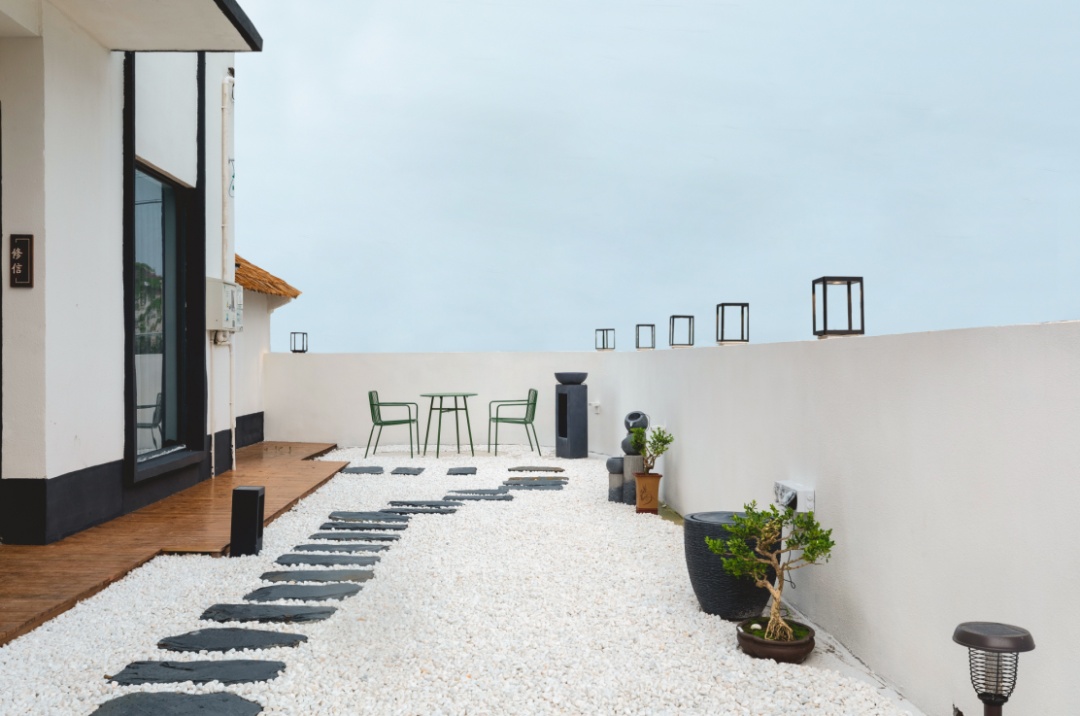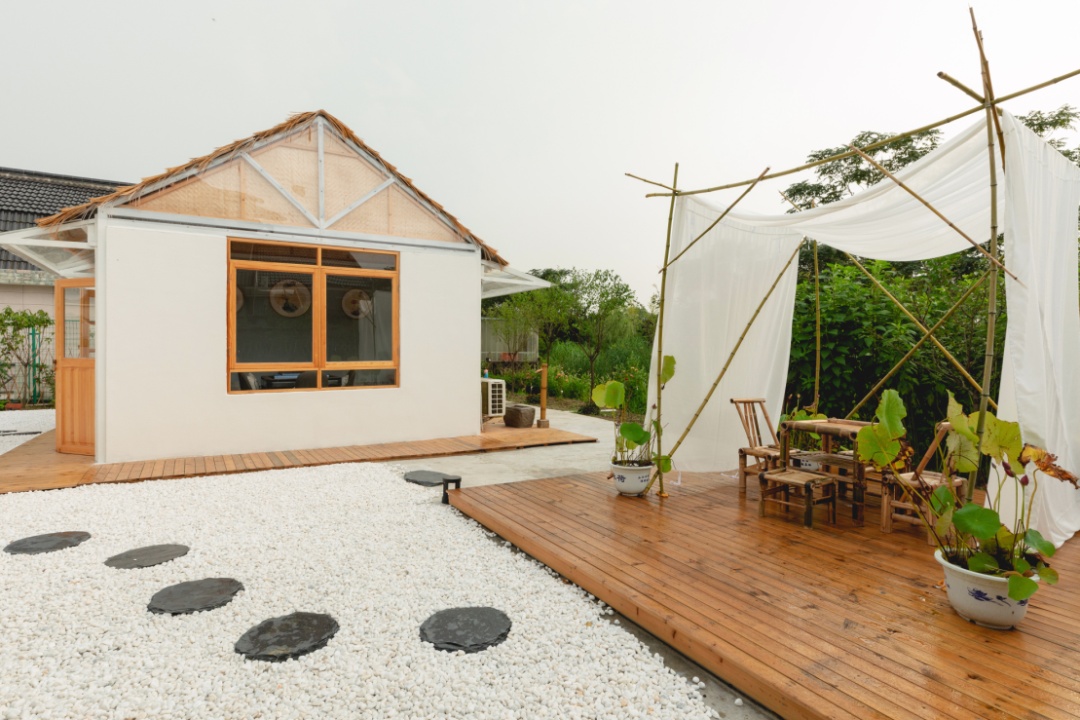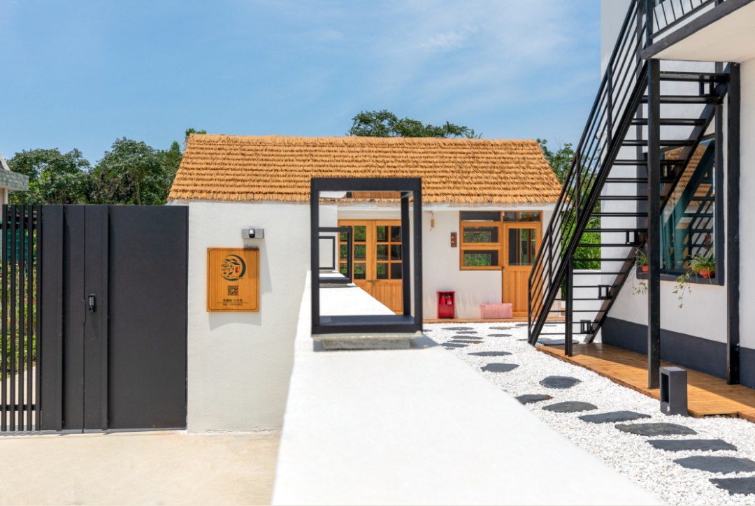 建设公路旁,“念舍禅”民宿就坐落在虹桥村村口,还未走近,不同于周边屋舍的一抹亮白,便让人轻易认出它来。“念”有心心念念之意,寄托着主人对美好田园生活的憧憬;“禅”有体悟当下之意,表达出主人想要创建一处居所,能带给来客明净安定的体验。