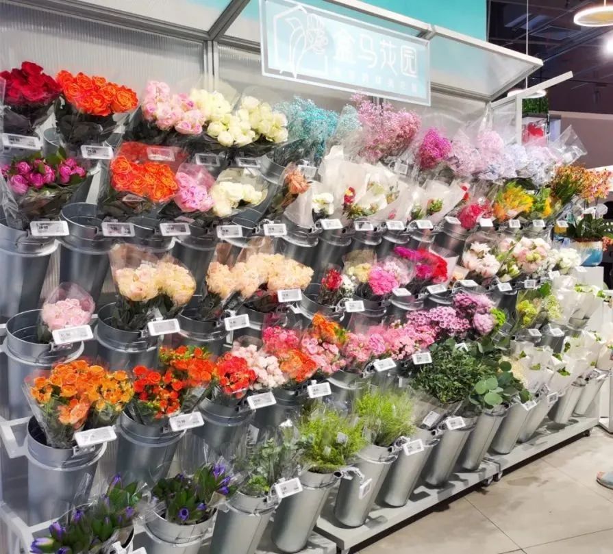 上午12时,“宁宁”在位于中山公园商圈的盒马鲜生长宁来福士店看到,左侧入口处的鲜花售卖区人来人往。这处占地约30㎡的空间陈列了近百种鲜花,除了常规售卖的60种鲜花外,这几日还特别上新了数款七夕主题花束。主题花束由玫瑰、百合、尤加利叶等品类组合而成,有简约和精致两种风格,能满足不同需求的市民。